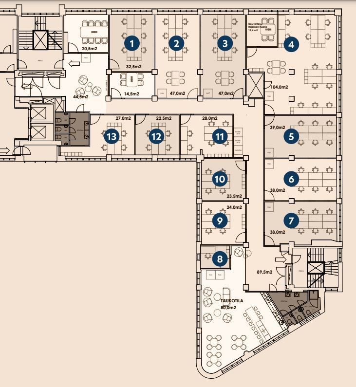 Vuokrataan kompaktia toimistotilaa Tallbergintalon merellisestä ympäristöstä Salmisaaresta. Tämä vapautunut tila on ilmoituksen pohjakuvassa merkittynä numerolla 2.