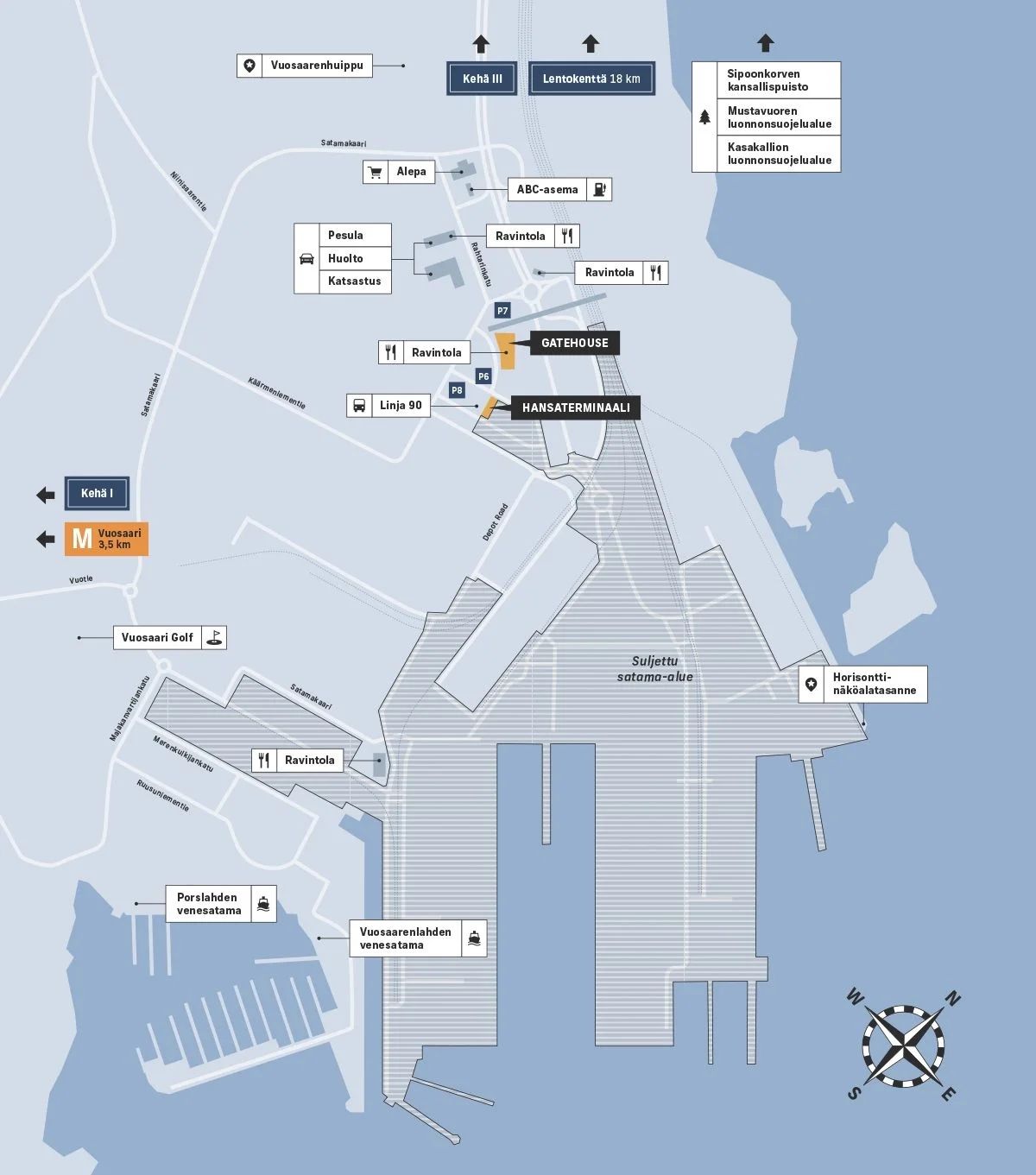 Gatehouse ja Hansaterminaali sekä pysäköintitilat muodostavat porttikeskuksen, jonka käyttäjiä tukevat myös alueen muiden kiinteistöjen palvelut. Kun vuokranantaja on itsekin merenkulun ja logistiikan ammattilainen, voi vuokralainen luottaa siihen että tilojen liiketoiminnalliset tavoitteet ovat avainasemassa. Satama-alueen merkittävältä kiinteistönomistajalta voi vuokrata toimistotilan lisäksi myös muita liiketoimintaa tukevia tiloja.
