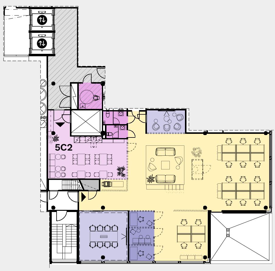 Vuokrattavana neljännen kerroksen laadukasta, avaraa toimistotilaa, jossa on erikokoisia tiimihuoneita.