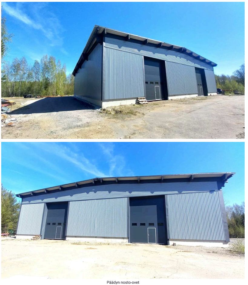 Ovet: 3 kpl Turner Door Oy:n nosto-ovia (4,5 m leveys x 6 m korkeus), 1 kpl eristetty ja ikkonoitu Prido AB -taitto-ovi (3 x 2,5 m).