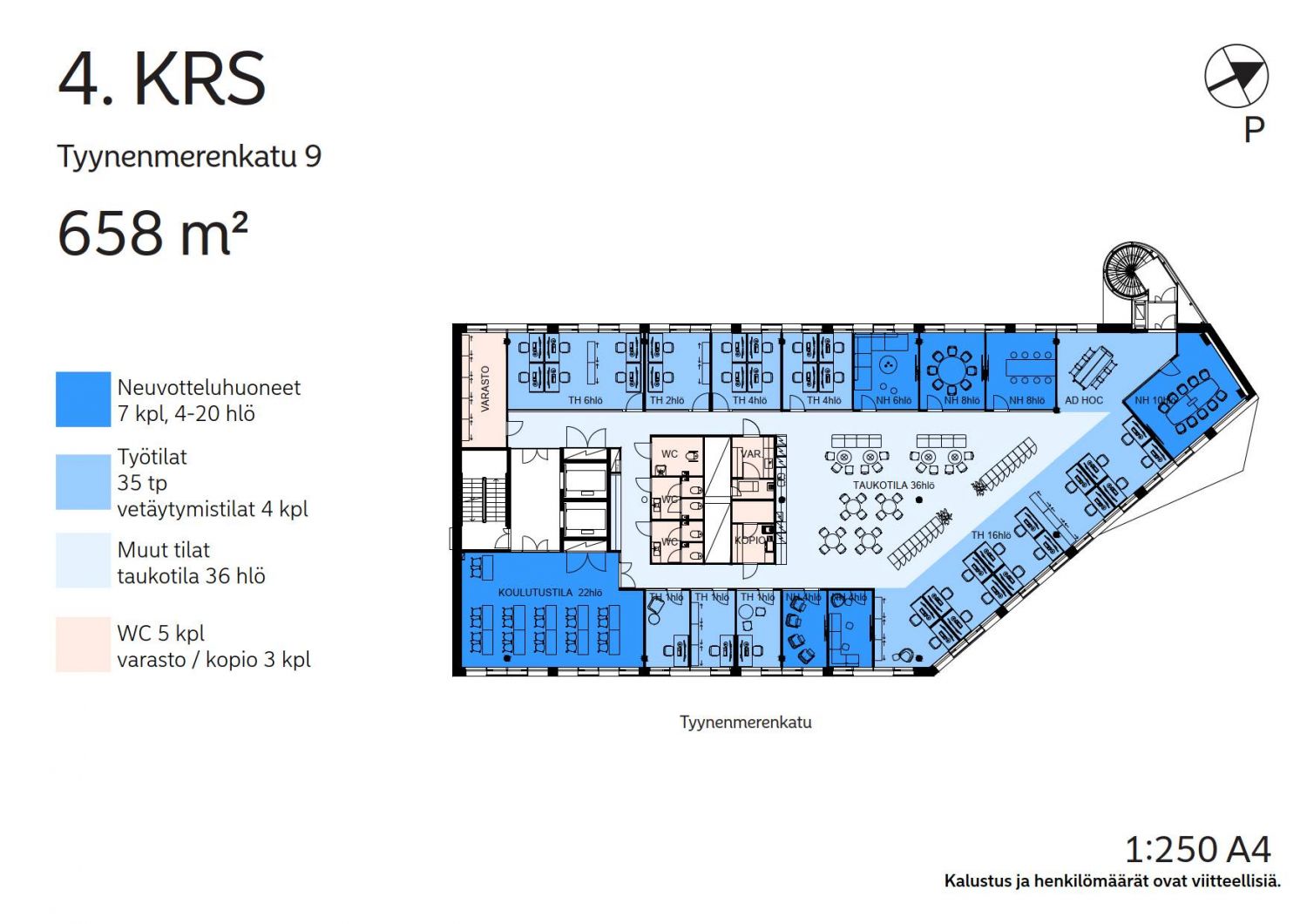 Toimisto: Vuokrattavana 4. kerroksen siisti 658 m2 toimistotila, jossa useita työhuoneita sekä avotilaa. Tilajakoa on myös mahdollista muokata käyttäjän tarpeiden mukaan.