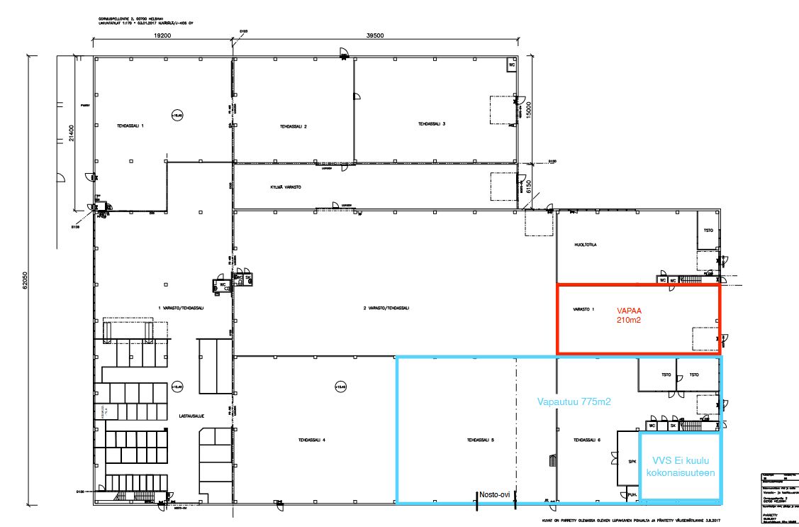 Kaksi nosto-ovea tilaan 3.9x3.9 ja toinen pienempi 2.3x2.5. Wc ja tsto huoneita 5kpl. Mahdollisuus myös jakaa kahdeksi tilaksi 325m2 ja 435m2.