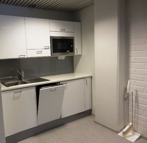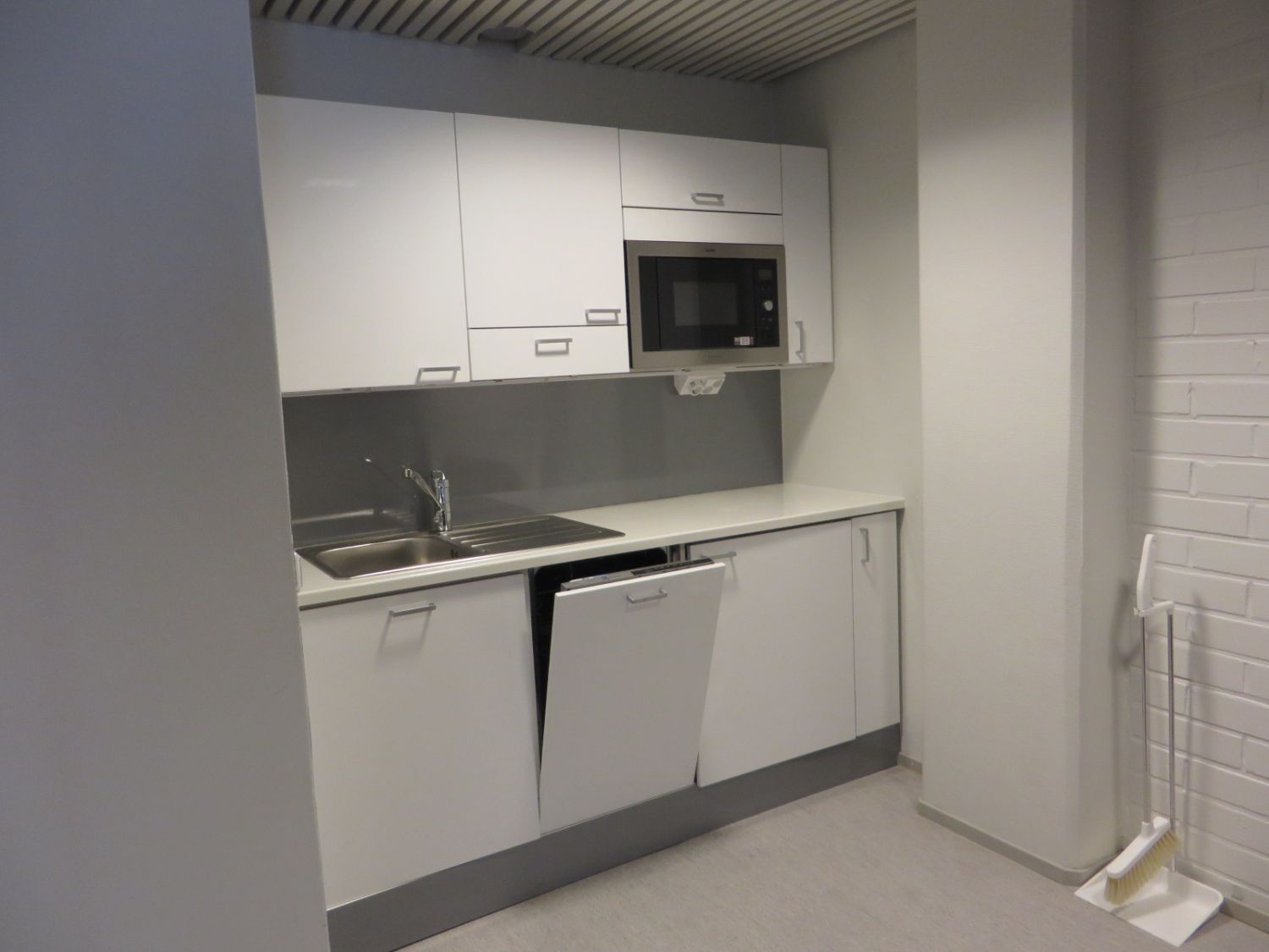 Siinä on 3 huonetta ja aulassa on keittiövarustus (jääkaappi, astianpesukone, mikro sekä kaapistot). Lisäksi wc ja erillinen siivouskomero.