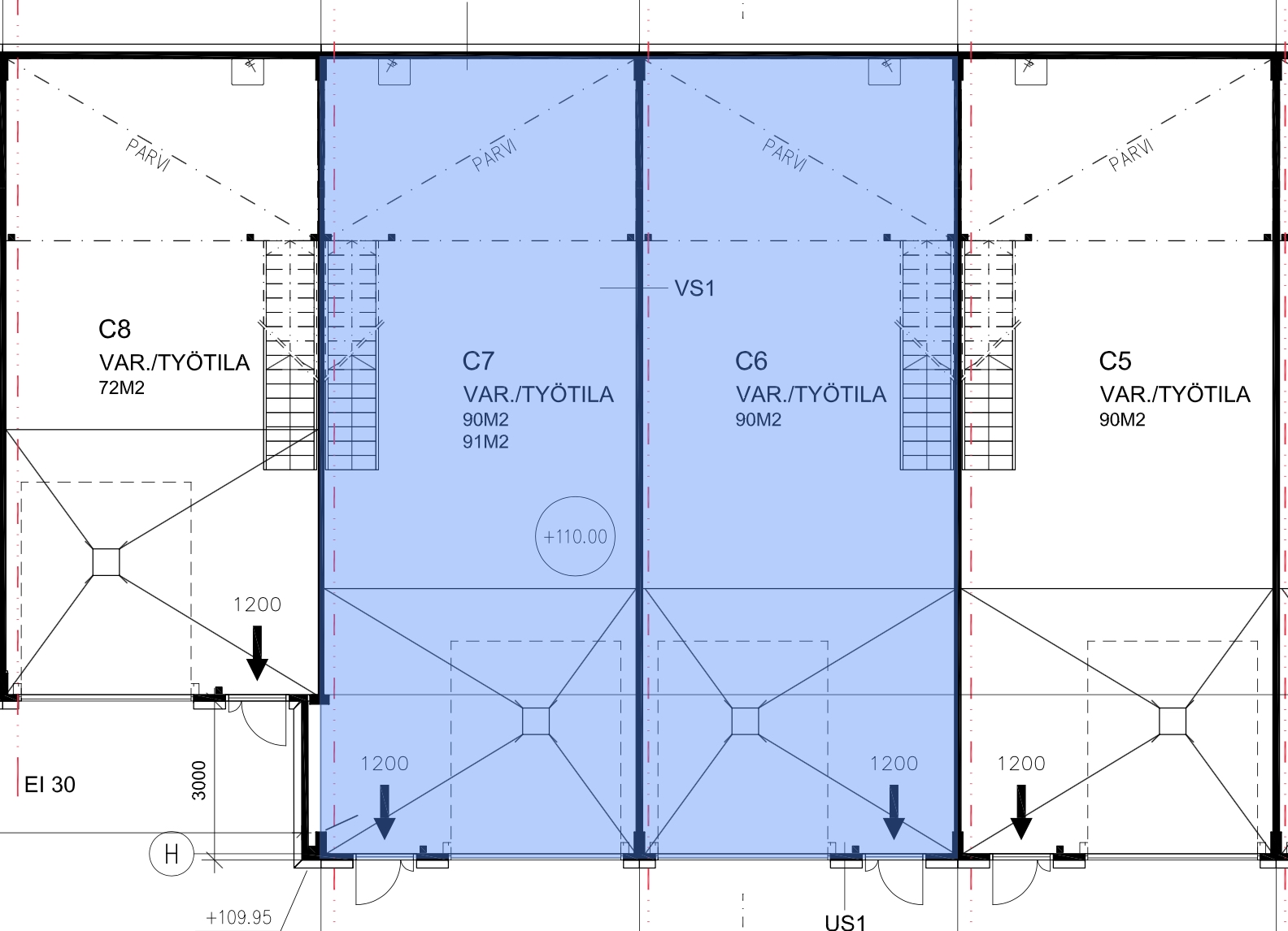 - Tilaan erillinen käyntiovi sekä tavaraliikennettä varten korkea sähkökäyttöinen nosto-ovi (korkeus 4 m)