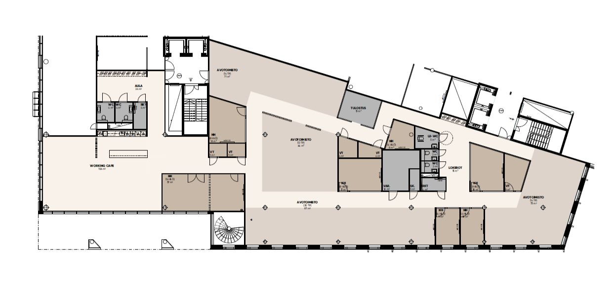 Valoisa ja moderni tila tarjoaa yhteensä 852 m², pohjaratkaisun. Tilat on toteutettu avotilojen, työhuoneiden sekä vetäytymis-ja neuvottelutilojen yhdistelmänä. Lisäksi käytössä on viihtyisän working lounge joka toivottaa niin työntekijät kuin vierailijatkin tervetulleeksi kohteeseen.