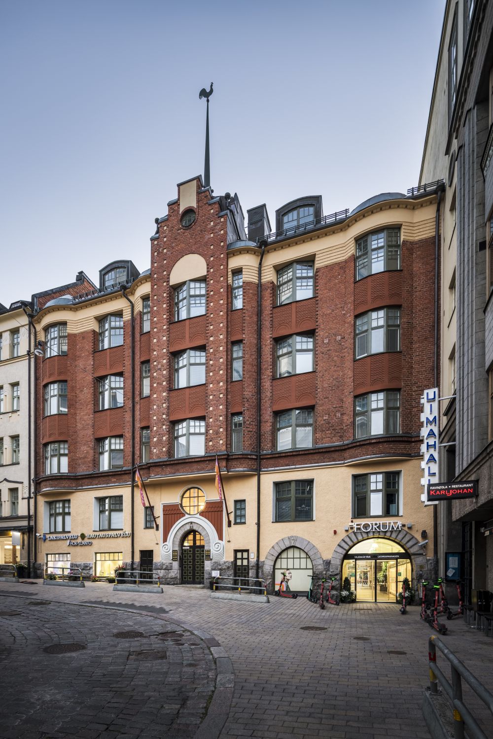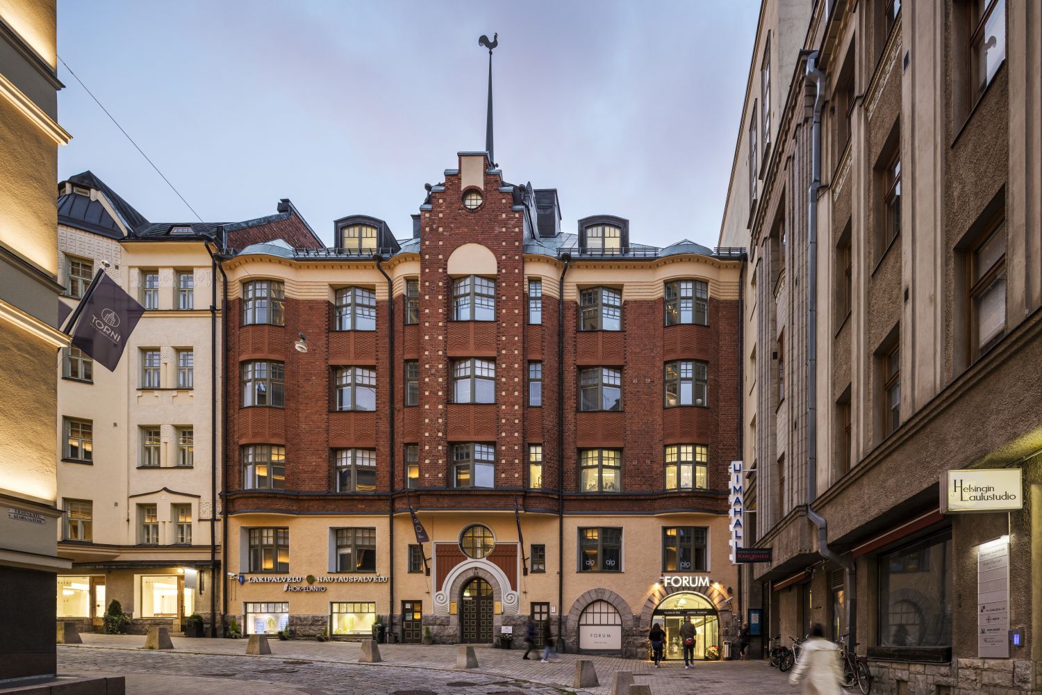 Yrjönkatu 23 valmistui vuonna 1908 ja edustaa 1900-luvun alun tanskalaisvaikutteista jugendia. Mannerheimintie 16 puoleinen osa on valmistunut 1890. Sisäpihan 1920-luvulla valmistuneessa entisessä elokuvasalissa toimivat nyt yökerho ja ravintola. Forum-korttelin ainutlaatuinen kokonaisuus muodostuu kuudesta kiinteistöstä. Helsingin keskeisimmällä paikalla sijaitsevissa rakennuksissa on persoonallisia yksityiskohtia ja pitkän kulttuuriperinteen tuomaa arvokkuutta.