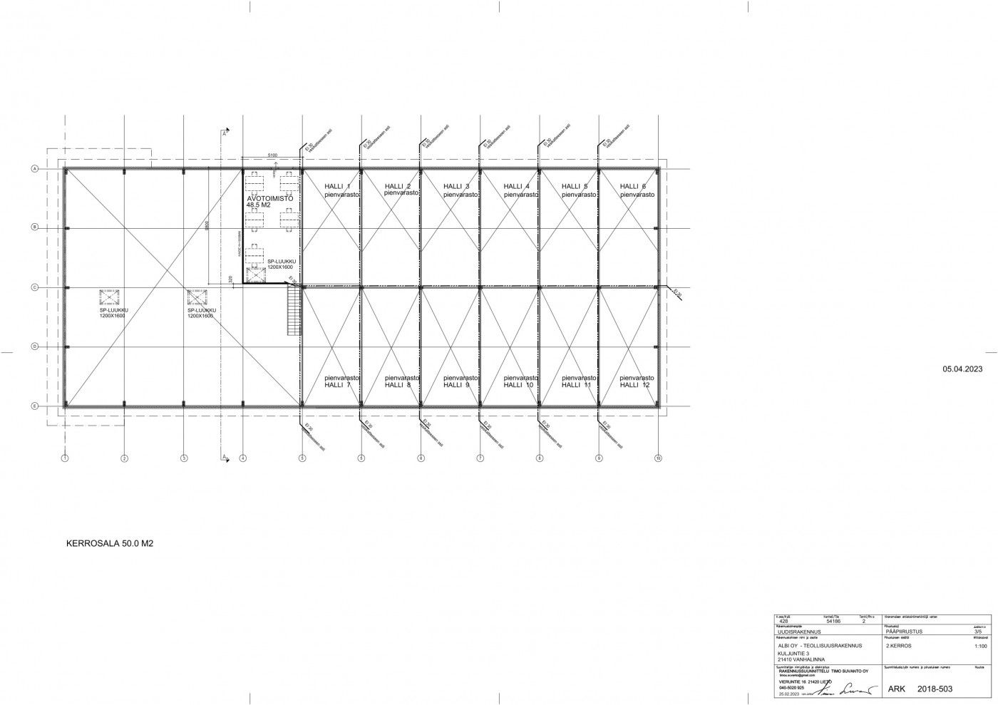 Hallin vapaa korkeus on noin 6 metriä, ja se on varustettu 4,5 metriä korkealla ja 3 metriä leveällä nosto-ovella. Tilan mitat ovat 20 m x 20 m.