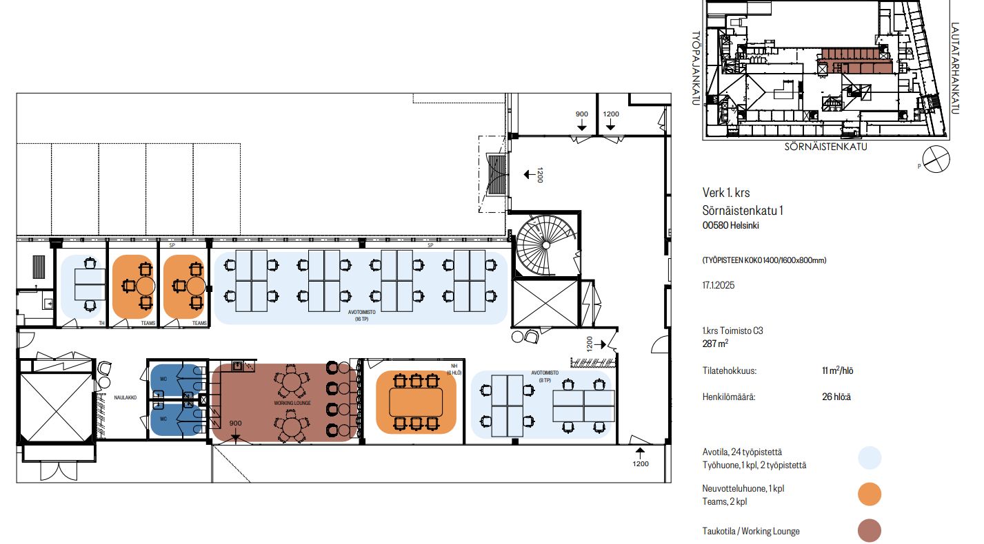 Vuokralaisella on käytettävissään tyylikäs Lounge- ja keittiöalue, johon on oma sisäänkäynti kohteen atriumtyylisistä yleisistätiloista. Lisäksi käytössä on myös toinen sisäänkäynti. Tilaratkaisut toteutetaan neuvotteluhuoneen, sekä 3 toimisto/vetäytymistilan yhdistelmänä. Käytössä on myös avotoimistotilaa yhteensä 24 henkilölle. Tilan näkymät avautuvat kohteen atriumpihalle sekä sisäpihan puolelle.