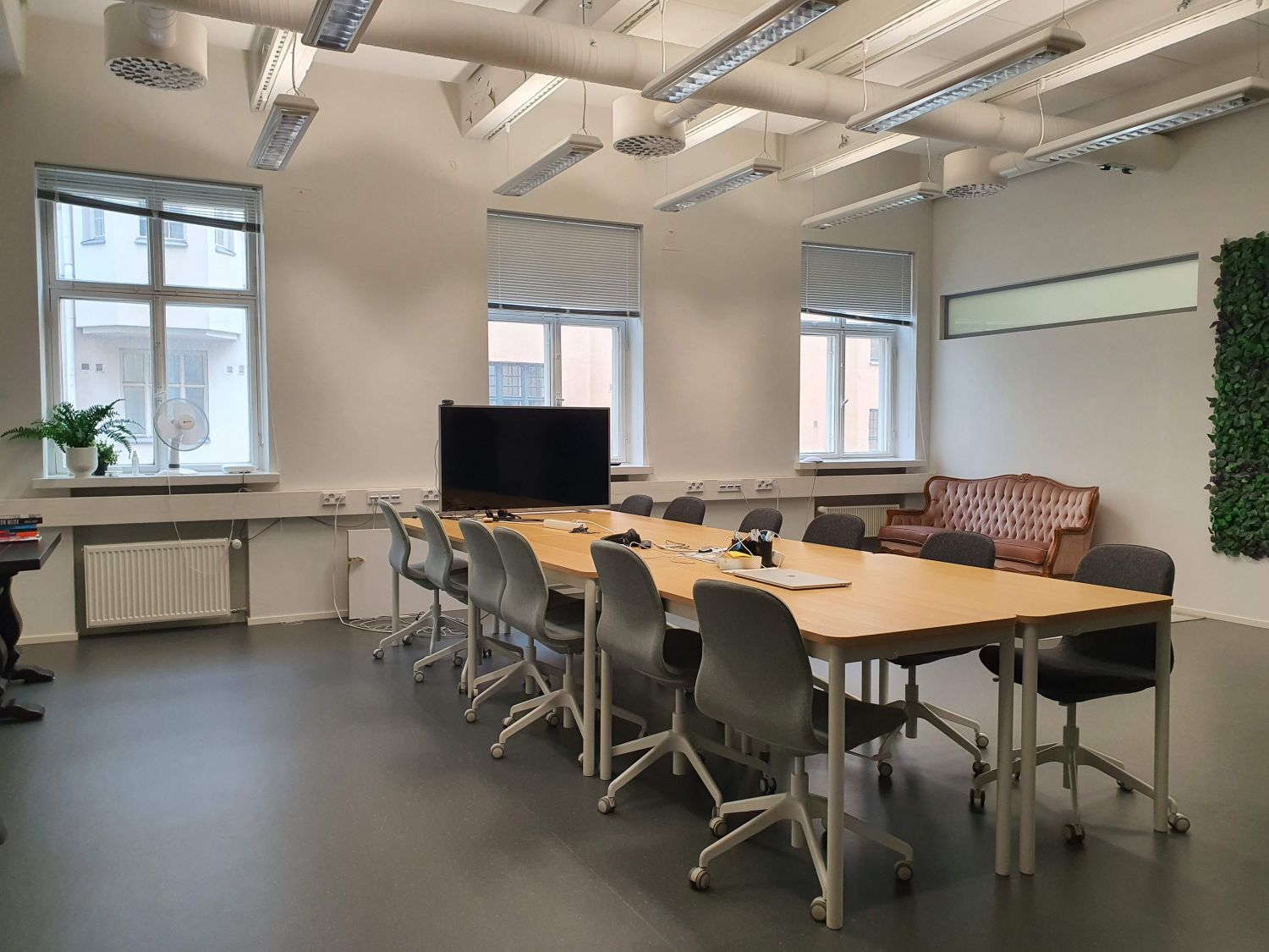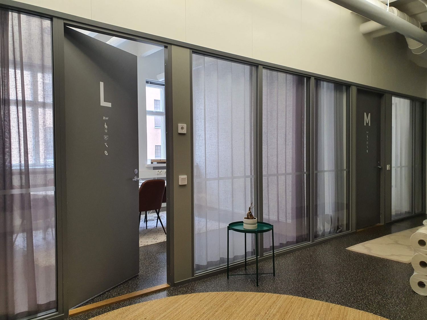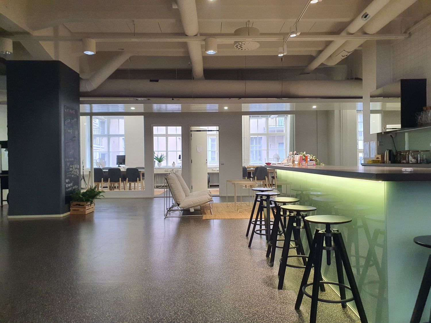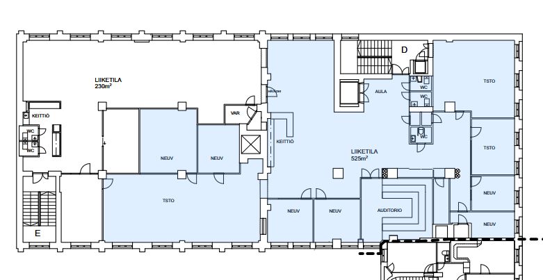 Kokonaisuudesta löytyy avotilaa, erikokoisia neuvottelutiloja, työhuoneita, longe näyttävällä baarikeittiöllä, amfiteatteri, 2 WC-tilaa ja inva-WC.
