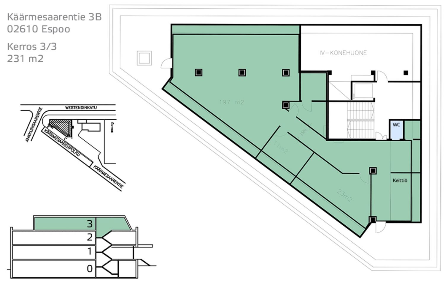 Toimisto sijaitsee rakennuksen kolmannessa kerroksessa. Kiinteistössä on hissi kulkua helpottamaan. Toimistosta avautuu dynaamiset näkymät Länsiväylän suuntaan ja muun muassa vehreään asuinalueen suuntaan. Kävellen vain sillan ylitys ja olet Tapiolan puolella. Läheisyydessä on myös merenranta, mikä lisää alueen viehättävyyttä.