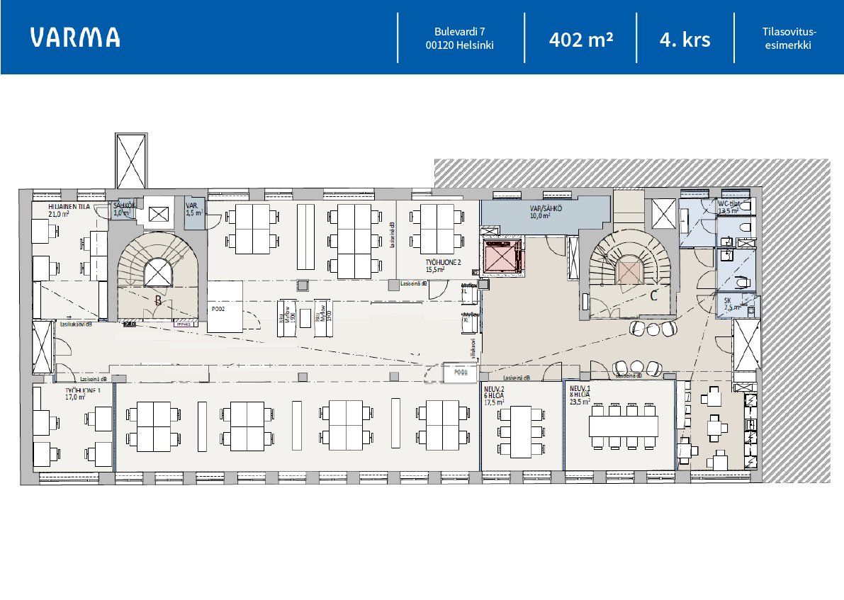 Bulevardi 7 tarjoaa toimitiloja yrityksille, jotka etsivät ainutlaatuisia puitteita: Helsingin halutuinta keskustasijaintia, kiinteistön pitkää ja vaurasta historiaa sekä tilojen viimeisteltyä laatua ja toimivuutta. Kiinteistö valmistui mittavasta remontista vuonna 2022. Kysy tilavaihtoehdoista lisää! Muuttovalmis toimistohuoneisto sisäpihan rakennuksessa.