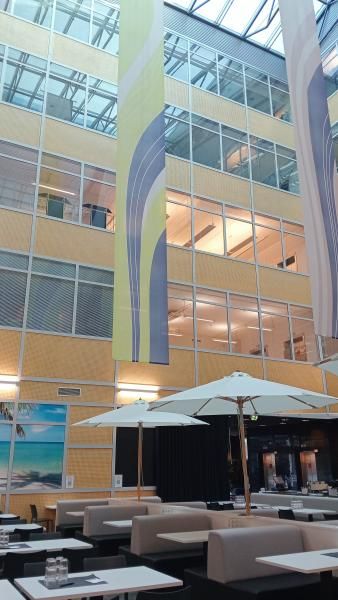 Lounasravintola, coworking tiloja, vuokrattavia neuvottelutiloja, puhekoppeja, kuntosali, aulapalvelu.