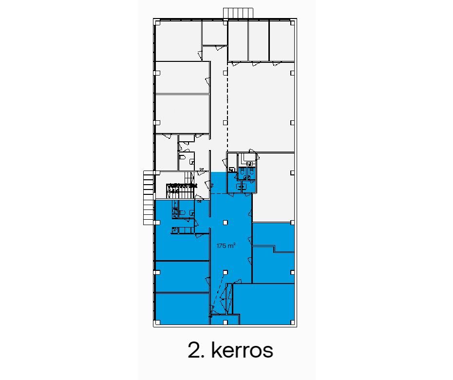 Toimisto koostuu työ-/neuvotteluhuoneista, erillisestä keittiöllisestä taukotilasta sekä wc-tiloista. Tila on jaettavissa 126 m² ja 228 m² kokoisiin kokonaisuuksiin tarvittaessa.