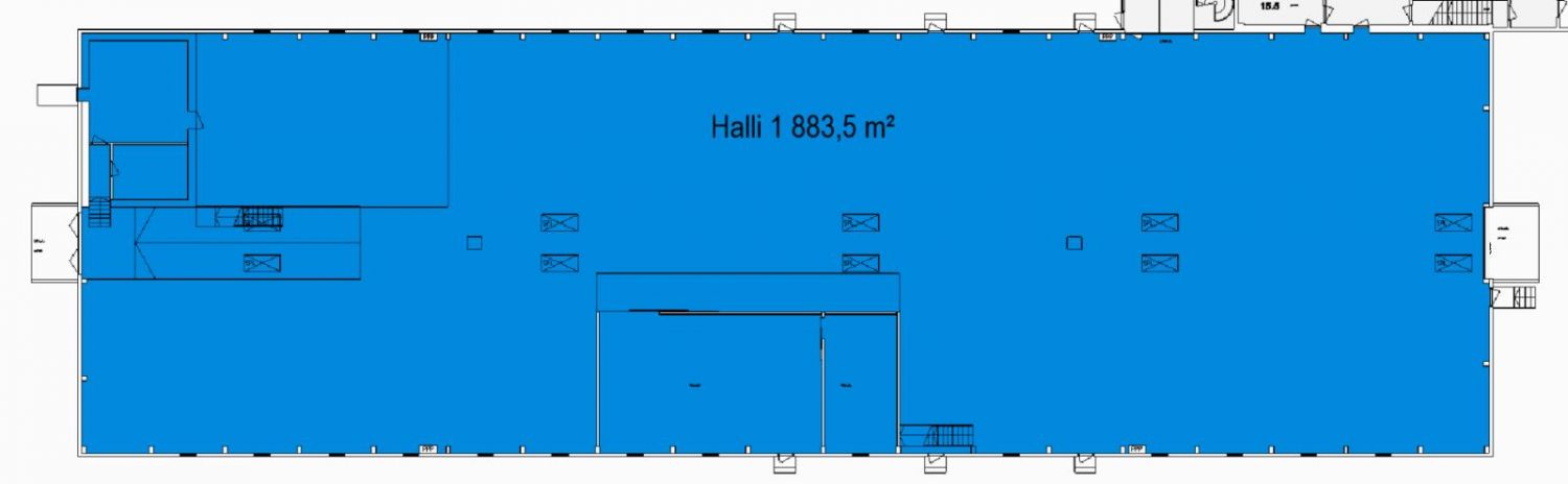 Kokonainen hallivarastotila, jossa yksi lastaustasku ja maantason nosto-ovi toisessa päädyssä. Halli on pilariton ja vapaakorkeus on n. 6m. Halli on muokattavissa uuden käyttäjän tarpeisiin. Sisältää sosiaalitiloja ja toimistohuoneita.