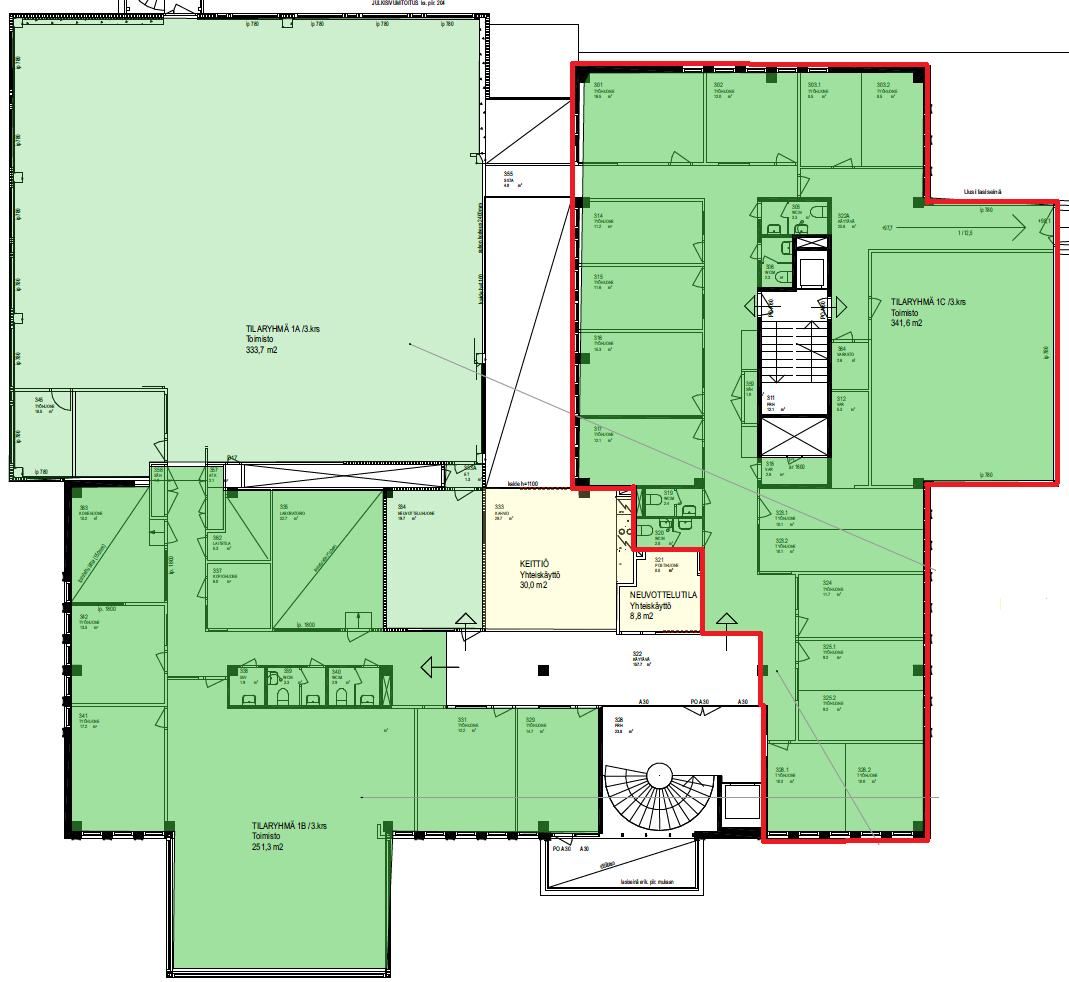 Vuokrataan siisti 341m² toimistotila kiinteistön 3. kerroksesta. Tila koostuu useista erikokoisista huoneista, sekä yhdestä isosta avotilasta. Remontoidaan täysin vuokralaisen tarpeiden mukaan. Rakennettavissa oma keittiö tai sitten käytettävissä kerroksen yhteiskeittiö. 4 kpl WC. Talo tarjoaa vuokralaisten käyttöön ilmaiseksi 2 kpl neuvotteluhuoneita 1. kerroksesta. Näiden varaus järjestelmän kautta. Kiinteistöllä oma parkkihalli, josta mahdollisuus saada pysäköintioikeuksia. Kellarista mahdollista vuokrata varastotilaa!