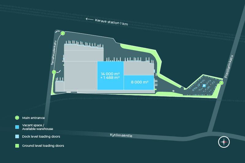 Kiinteistön sijainti Keravalla on logistisesti erinomainen junaradan ja Lahden moottoritien (E75) välittömässä läheisyydessä. Yhteys niin Helsingin keskustaan (31 km), lentoasemalle (20 km) kuin Vuosaaren satamaankin (23 km) on sujuva. Kiinteistölle on oma junaraideyhteys.