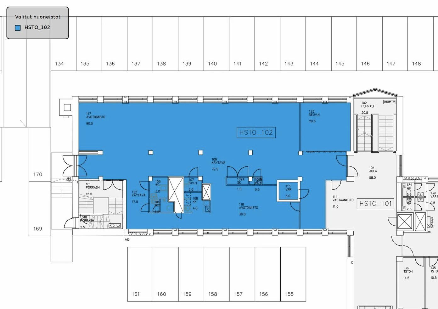 Vuokrattavana kolmannen kerroksen 316 m2 hyväkuntoinen tila.