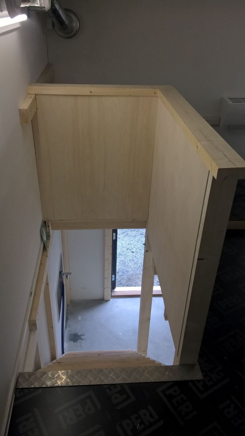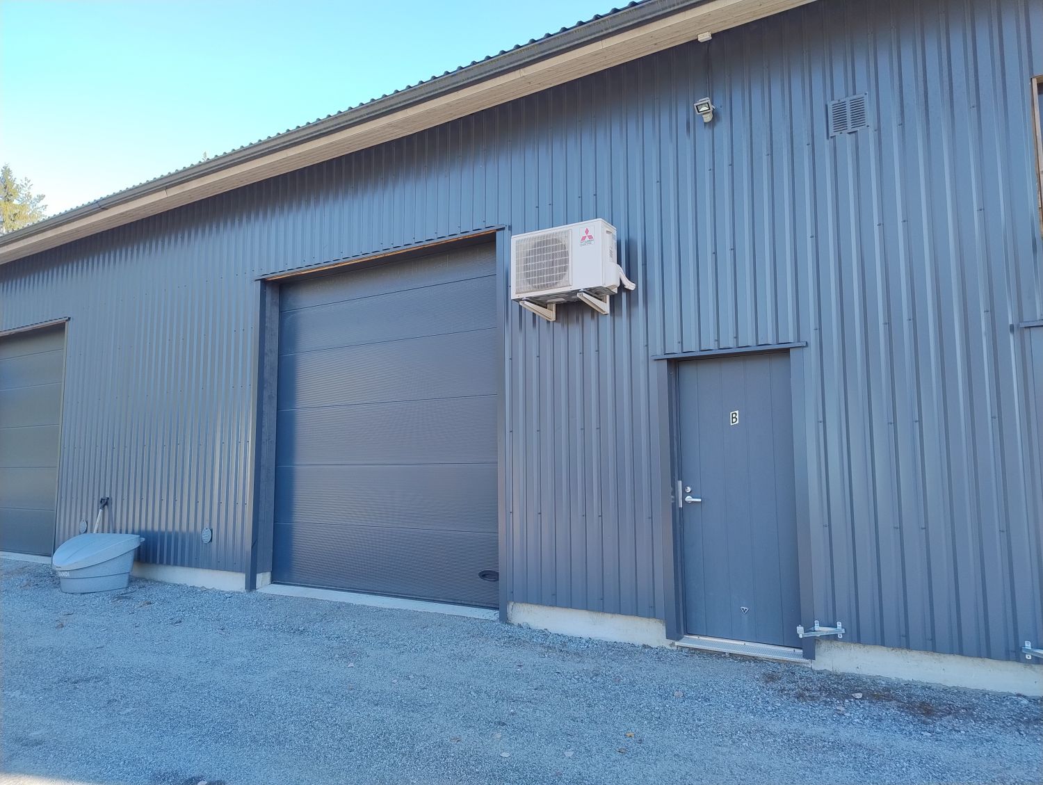 Käyntiovi, nosto-ovi, wc, hiekanerotuskaivo, ilmalämpöpumppu, varastoparvi. Hallin pohja lähes neliön muotoinen. Korkeus 4m.