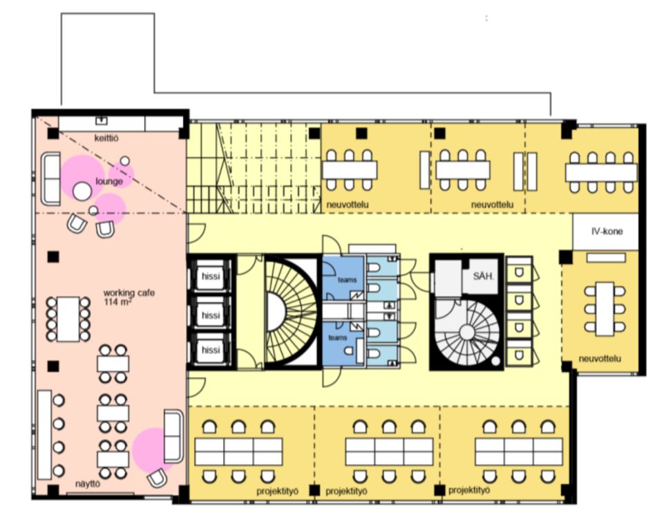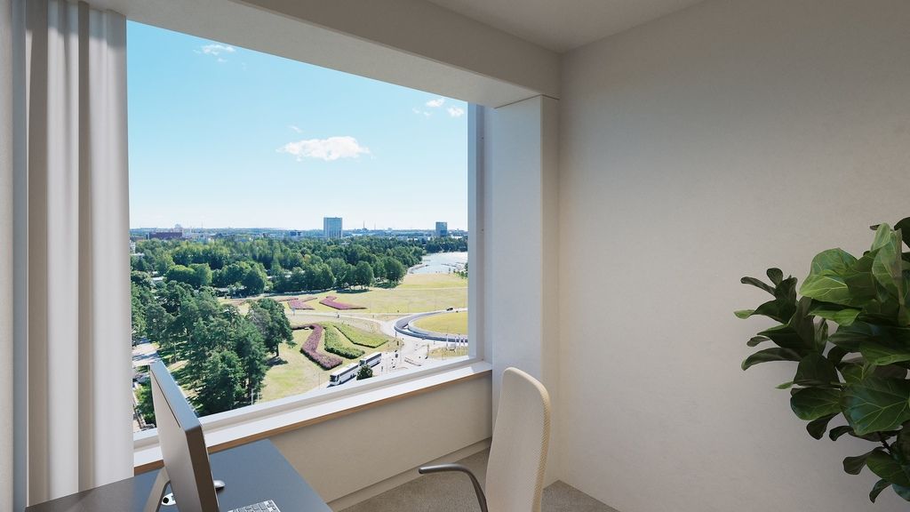 Vuokrattavaa toimistotilaa on vielä vapaana yhteensä 3737 m², joka jakautuu kerroksiin 3-11. Ensimmäisessä kerroksessa sijaitsevat aulatilat sekä avarat liiketilat, joiden ikkunat avautuvat neljään suuntaan. Kerrokset 2.-11. ovat toimistotilaa, yhden kerroksen ala on n. 415 m². Kerroksia voidaan yhdistää kahden tai useamman kerroksen tilakokonaisuuksiksi, tai tarvittaessa jakaa kahteen osaan n. 200 m² tiloiksi. Neljään suuntaan avautuvat tehokkaat kerrokset ja suuret ikkunat takaavat valoisat tilat ja avoimet näköalat aina merelle saakka. Tehokkaat ja joustavat kerrospohjat taipuvat monenlaisiin tilaratkaisuihin, ja ovat muokattavissa vuokralaisen tarpeiden mukaan. Tiloja on mahdollista jakaa joustavasti eri käyttötarkoituksiin, jolloin ne tukevat saumattomasti modernin työn tekemisen tapoja ja hybridityöskentelyä. Kuvat ovat havainnekuvia kiinteistön tiloista. Pohjakuvissa esimerkkejä mahdollisista tilasovituksista.
