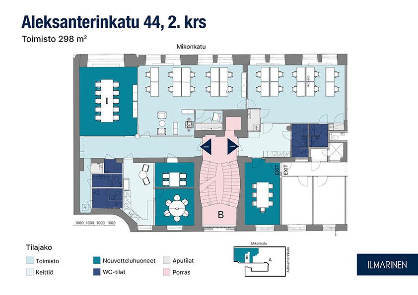 Toimisto 298 m² - Ainutlaatuinen työympäristö noin 20 hengelle. Toisen kerroksen monitoimitilassa yhdistyvät vanhan maailman charmi ja nykypäivän mukavuudet.