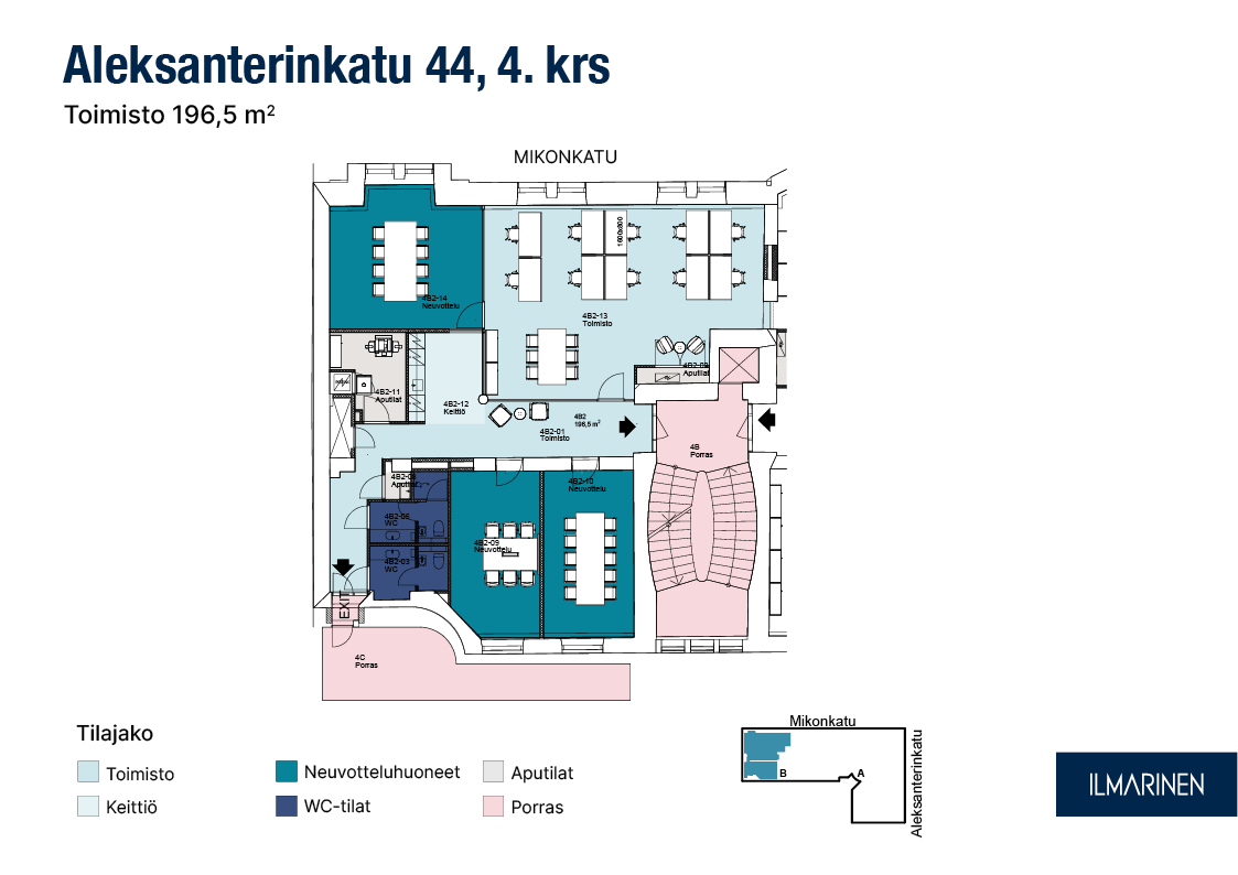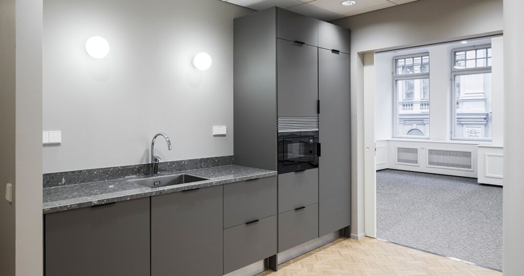 Toimisto 197 m² - Kaunis ja kompakti toimisto noin 14 hengelle. Neljännen kerroksen monitoimitilassa yhdistyvät vanhan maailman charmi ja nykypäivän mukavuudet.