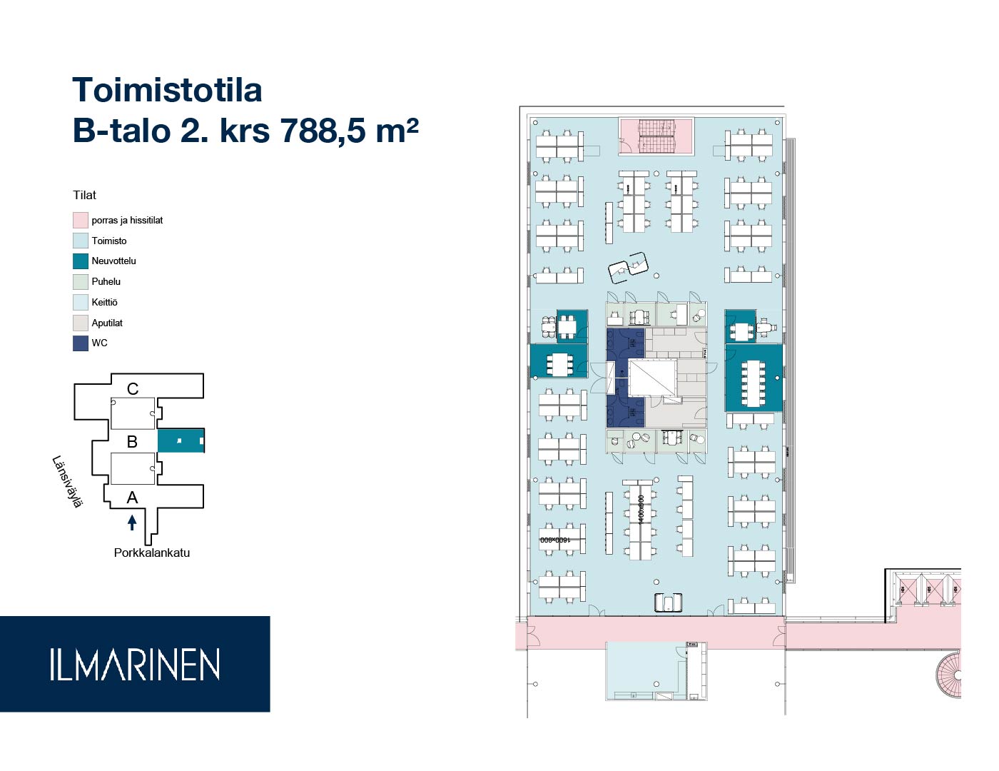 Toimisto 788 m² - Toisen kerroksen monitoimitila, joka on muokattavissa halutulla tavalla. Valoisaa ja huippumodernia tilaa noin 90 hengelle. Kattavat palvelut ja hyvät yhteydet.