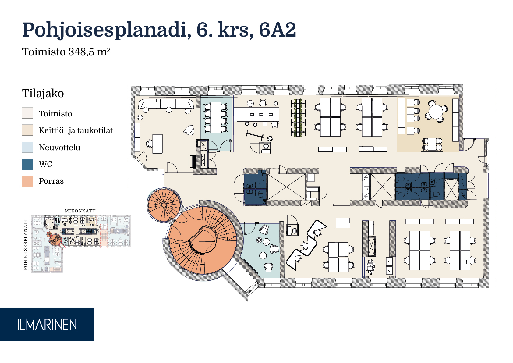 Toimisto 348,5 m². Korkeatasoinen työympäristö, täysin uudistetut muuntojoustavat toimistotilat. Korkeat huoneet ja mahtavat näkymät Mikonkadulle. Tilamalli monitilatoimisto.