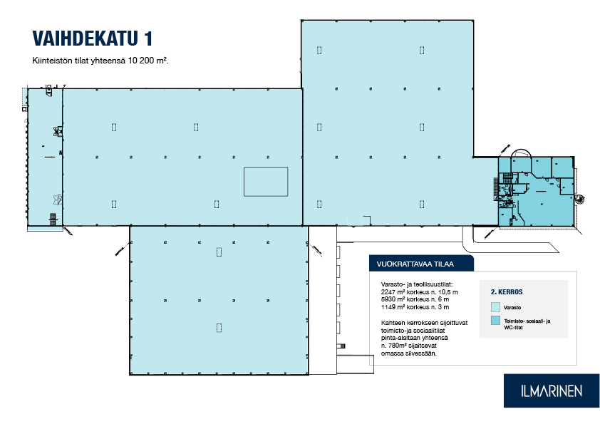 Teollisuus-, varasto- ja toimistokiinteistö vuokrattavana Keravalla Lahdentien tuntumassa. Kiinteistön tilat yhteensä 10 200 m². 2247 m² korkeus n. 10,5 m 5930 m² korkeus n. 6 m 1149 m² korkeus n. 3 m