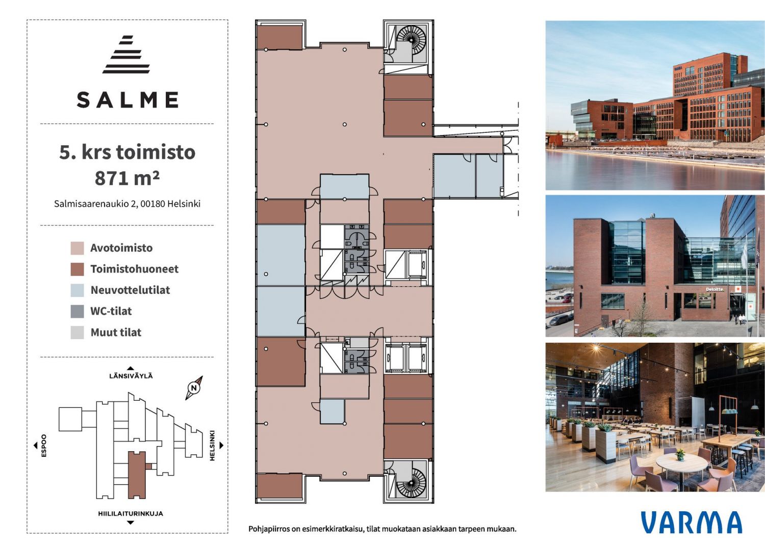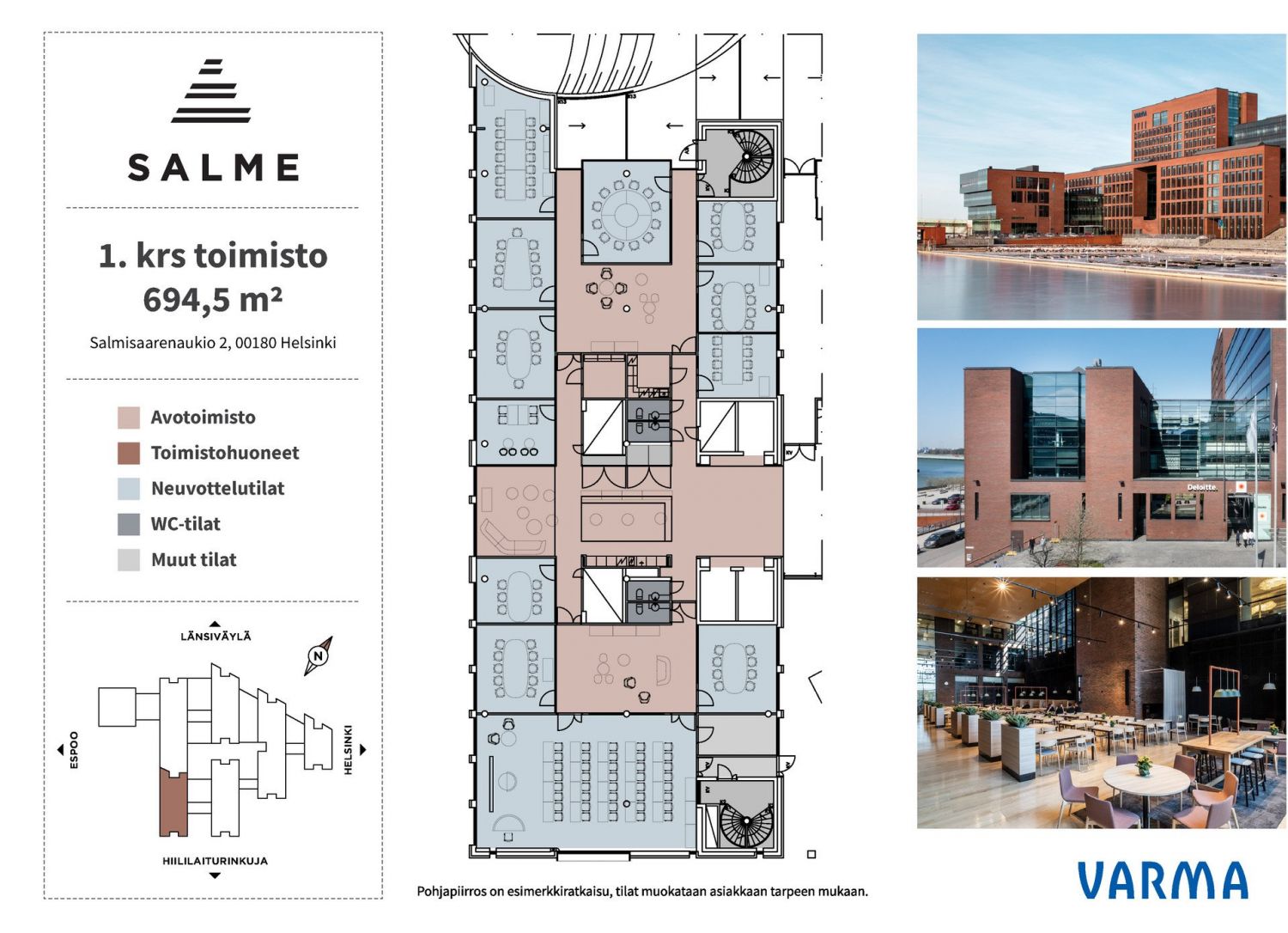 Pääkonttoritason toimitilaa merellisissä maisemissa. Ruoholahden ja Länsiväylän kupeessa sijaitseva Salmisaari on kaupunkilaiseen elämäntyyliin sopiva yrityspuistomainen alue, joka toimii useiden perinteikkäiden yritysten tukikohtana. Useista käytännöllisten ja tasokkaiden tilojen korkeista ikkunoista avautuu merimaisema. Tilat ovat tarjonneet puitteet menestyksekkäälle yritystoiminnalle vuodesta 2009. Osoitteessa Salmisaarenaukio 2 sijaitsevat modernit toimistotilat on mahdollista vuokrata kerrokset 1.-8. käsittävänä kokonaisuutena, joka tarjoaa hienot puitteet esimerkiksi pääkonttorille lähellä Helsingin keskustaa, Ruoholahden metroasemaa ja Länsiväylää. Hyvin varustellussa kiinteistössä on mm. oma ravintola, aulapalvelu, kokoustiloja, auditorio ja parkkihalli sähköautonlatausmahdollisuuksilla. Tilat muokataan vuokralaisen tarpeiden mukaan. Huom. kokonaisuudesta on mahdollista vuokrata myös yksittäisiä kerroksia tai pienempiä toimistokokonaisuuksia.