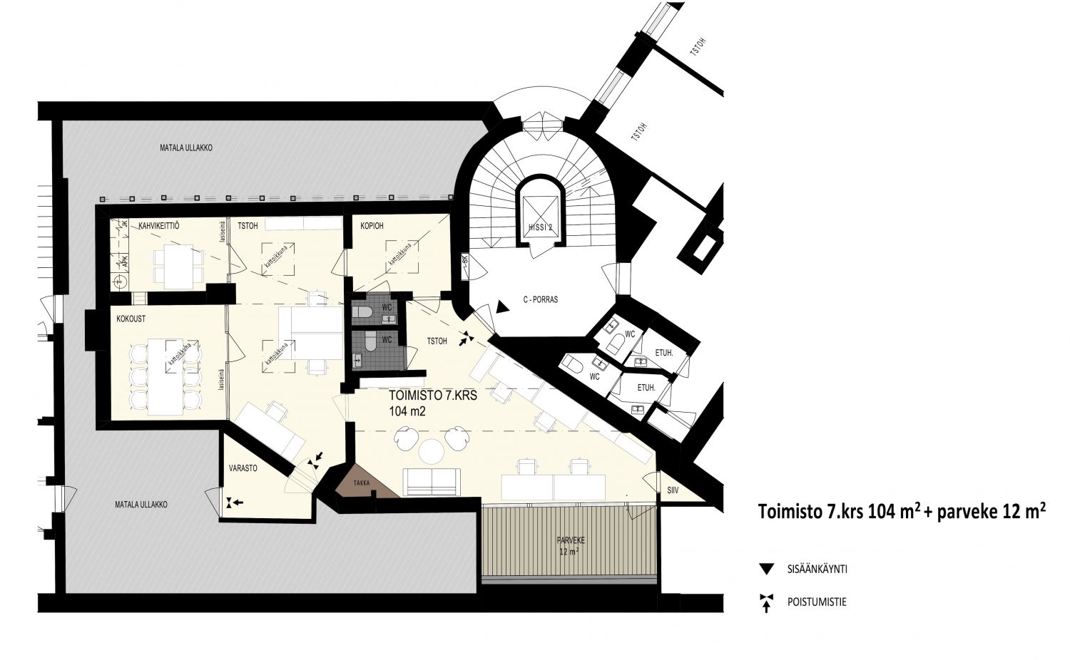 Pieni 7. kerroksen toimistotila, joka sijaitsee Arkadiankadun ja Runeberginkadun kulman "torniosassa". Ainutlaatuisena detaljina tässä tilassa on myös isohko parveke, josta upeat näköalat yli Töölön kattojen.