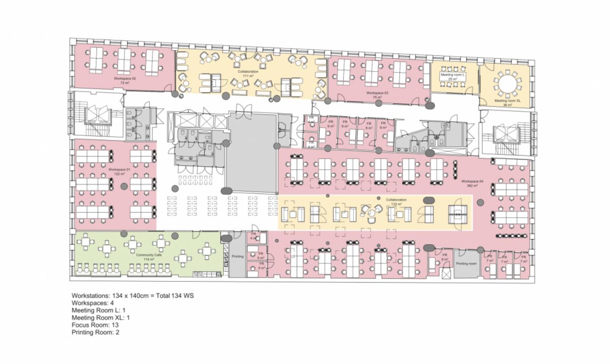 Mahdollista myös vuokrata kaksi päällekkäistä kerrosta, jolloin neliöitä on yhteensä 2610 m2.