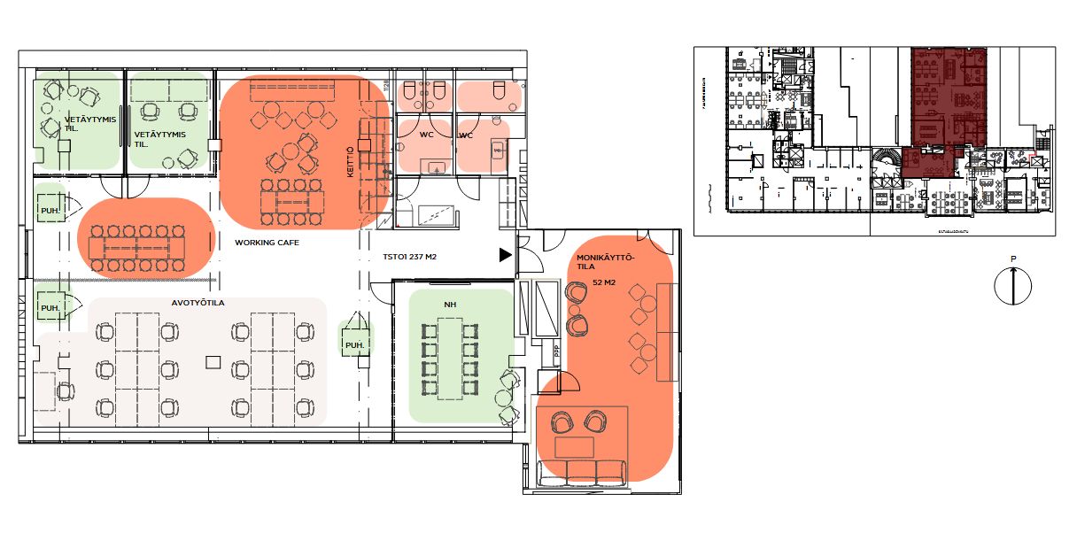 Tilassa on neljä vetäytymistilaa/neuvotteluhuonetta, monikäyttötila, keittiö-lounge/working-cafe, kaksi wc:tä sekä siivouskomero. Tilan tyyli on säväyttävä ja sisustus on kontrastinen, ja se on saanut vaikutteensa urbaanista kaupunkielämästä.