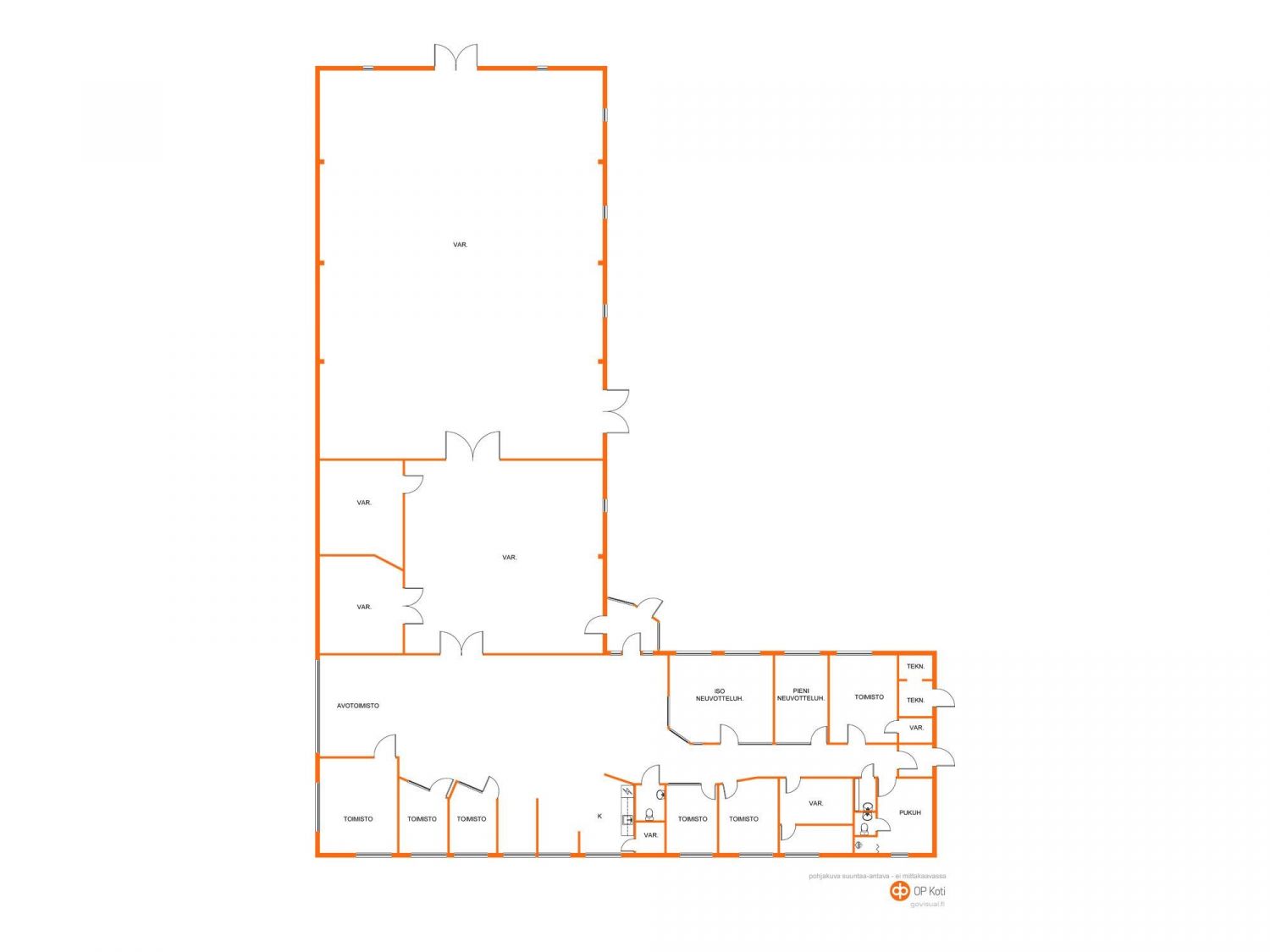 Pinta-alat: Toimisto ja asiakastilat noin 331 m2, lämmin varasto/tuotanto tila noin 141 m2, Lämmittämätön varasto/tuotanto tila noin 290 m2. Tilaerittely: 6xTYÖH,2xNH,AVOTILA,K,PKH,WC,SH,2xVAR/TUOT.TILA