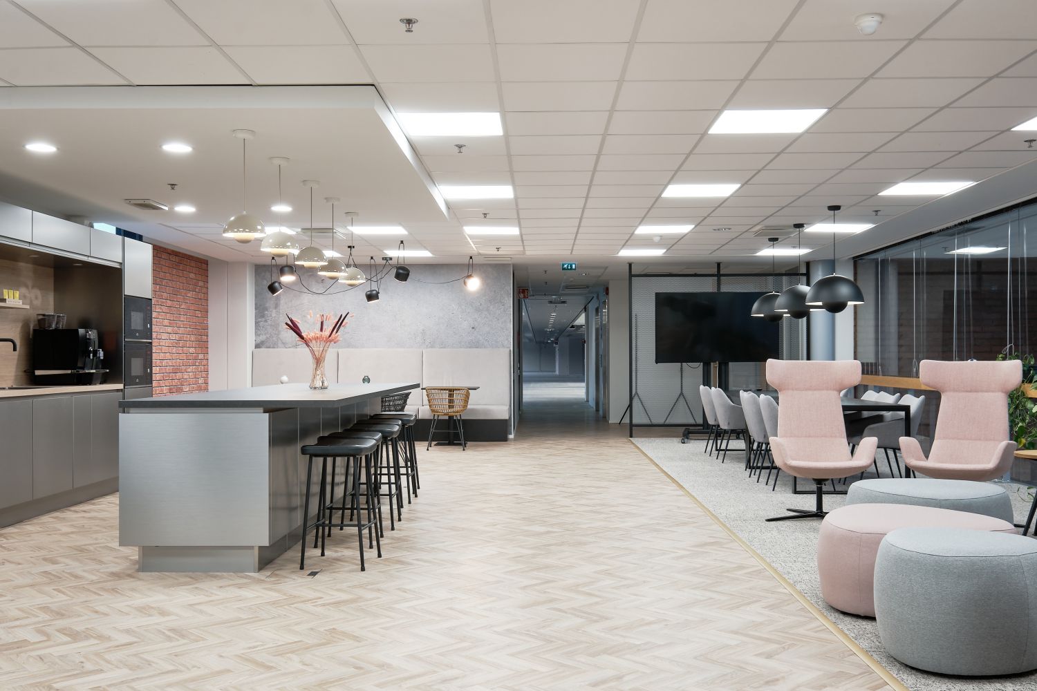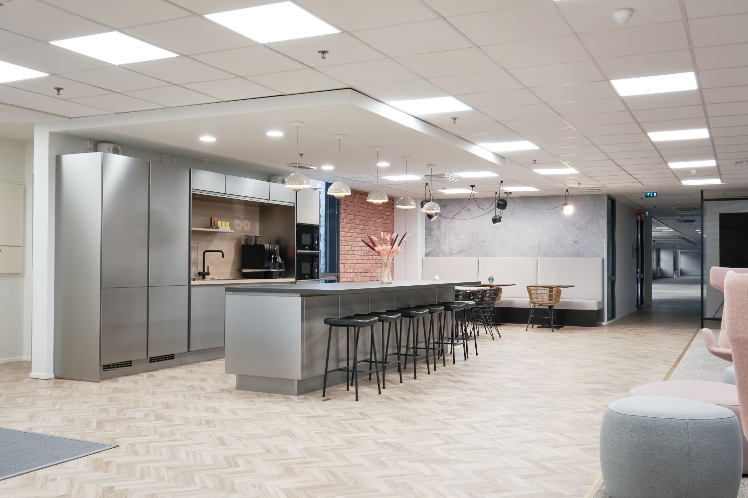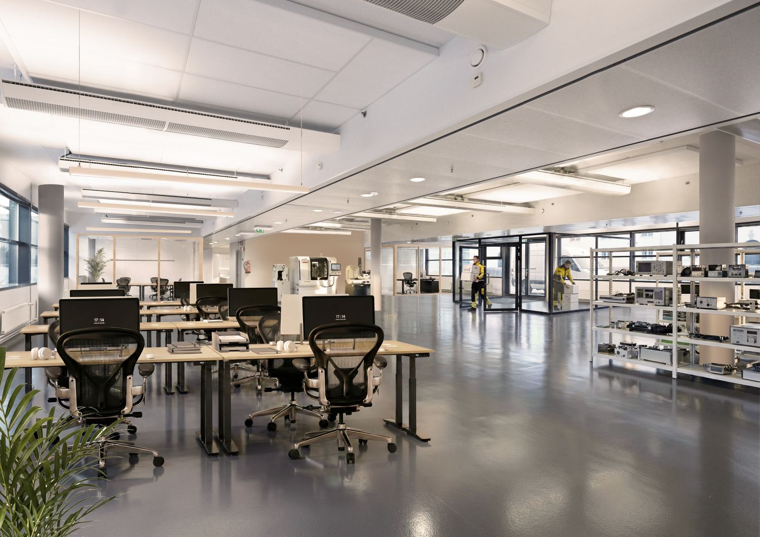 Valoisaa ja avaraa toimistotilaa keskeisellä paikalla. Tila on pääosin avotoimistoa, jonka mukavuutta lisää huoneilmanjäähdytys.