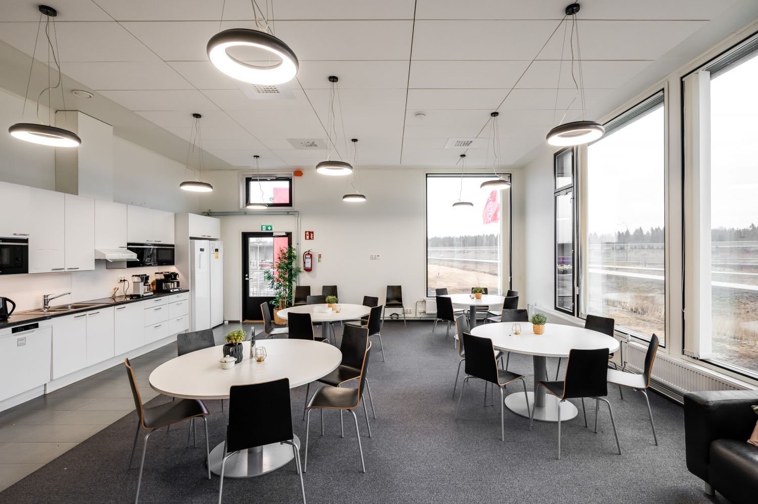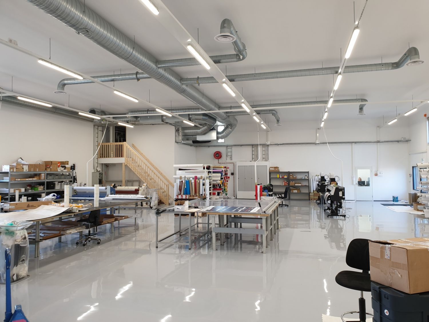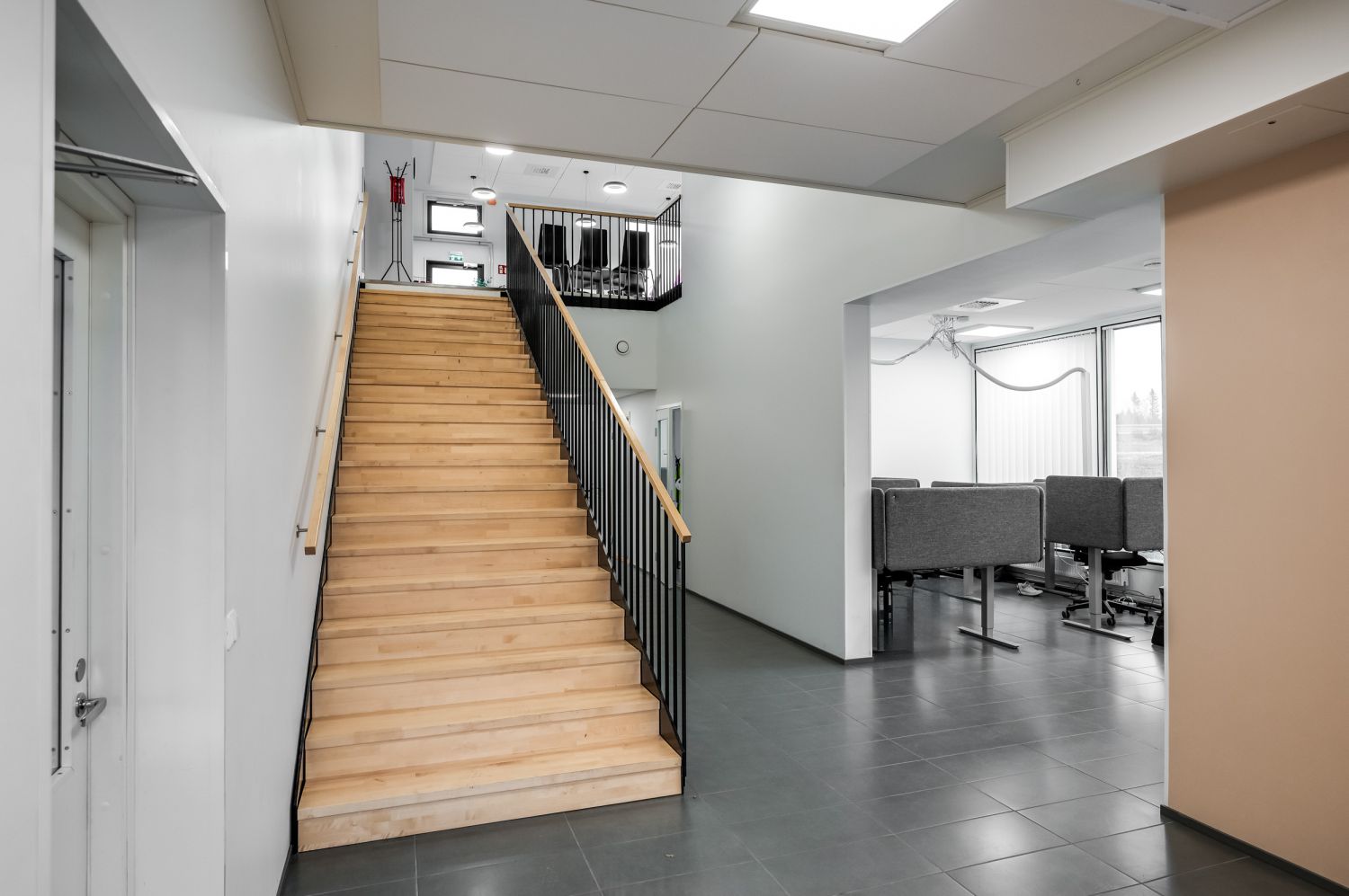 Toisessa päässä on korkea läpiajettava asennushallitila, jonka pinta-ala on n. 117 m2. Tästä ovellinen kulku tuotantopuolen tiloihin.