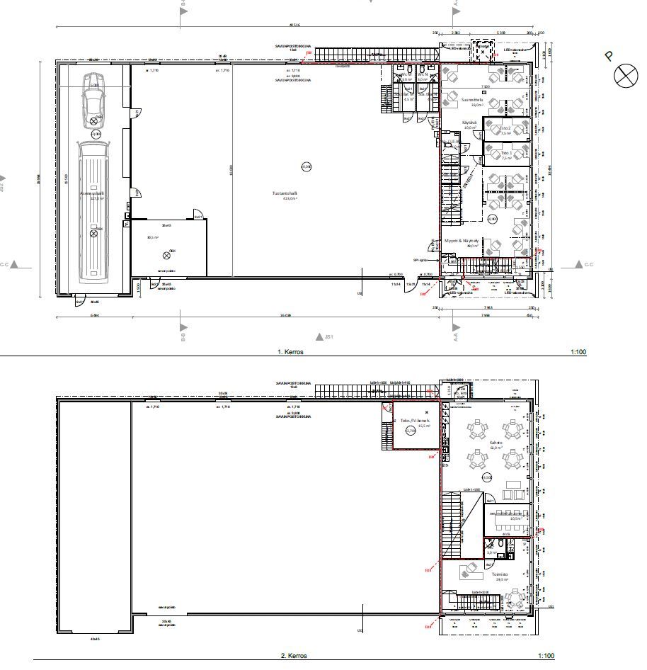 1. krs. myynti/näyttely ja toimistotila, jossa työpisteitä 17 hengelle sekä siivous- ja varastotila, pinta-ala yhteensä n. 113,5 m2.