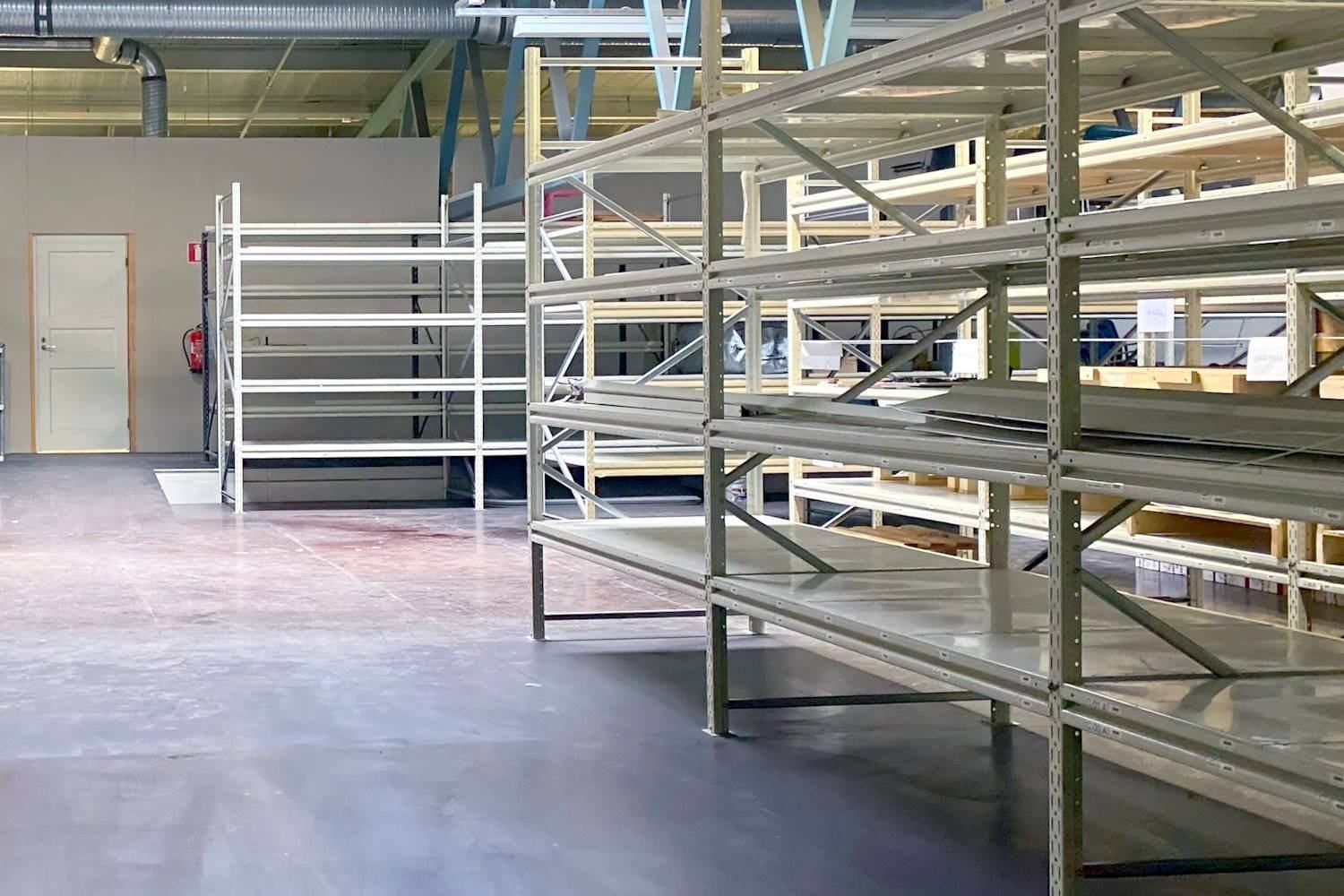 Varastotila soveltuu esim. pientavaroiden varastointiin. Hyllytilaa on runsaasti käytössä, mutta hyllyt voi myös purkaa tarvittaessa pois.