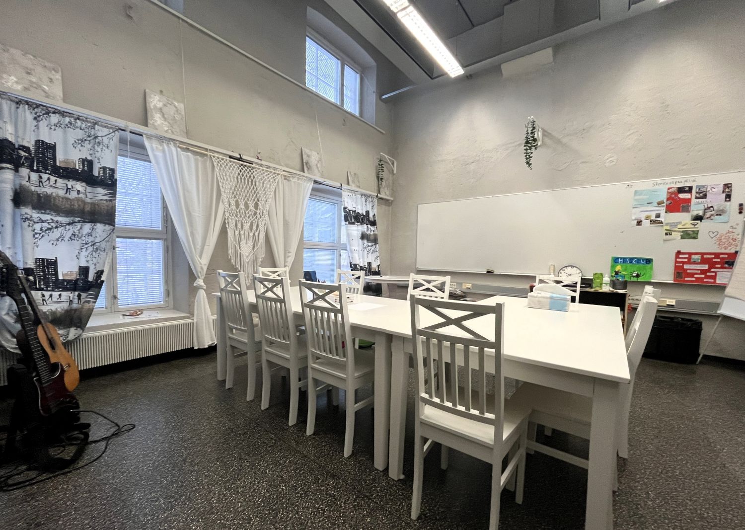 Tilassa on erikokoisia työ- ja tiimihuoneita sekä avara kokoontumis-, avokonttori- tai taukotila keskellä