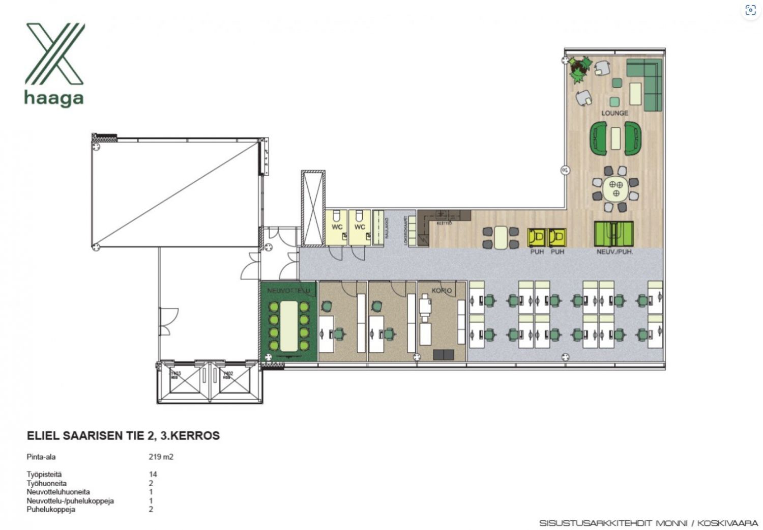 Eliel Saarisen tie 2 eli X Haaga on modernisoitu toimistotalo Pohjois-Haagassa, suoraan Hämeenlinnan väylän varrella ja Keskuspuiston syleilyssä. X Haaga on helposti saavutettavissa mistä tahansa päin pääkaupunkiseutua niin autolla, bussilla kuin junallakin. Helsingin keskustaan taittuu matka noin reilussa kymmenessä minuutissa ja lentoasemalle parissa kymmenessä minuutissa. Raide-Jokerin aloittaessa liikennöinnin 2024, on lähin pikaraitiovaunun pysäkki aivan talon vieressä.
