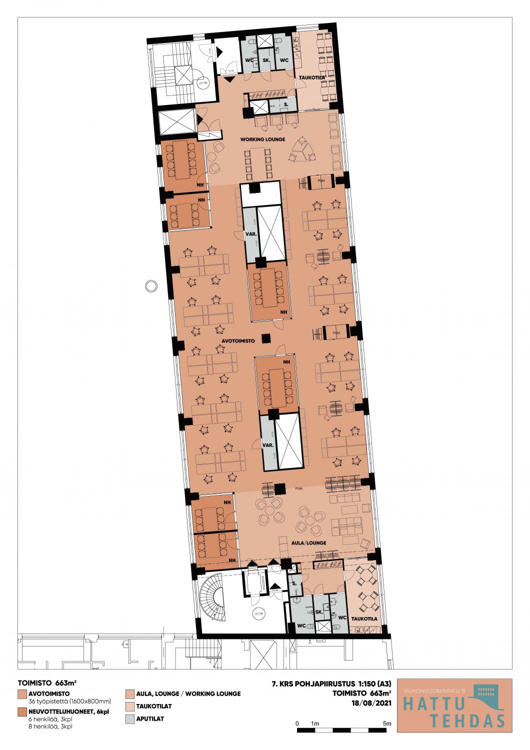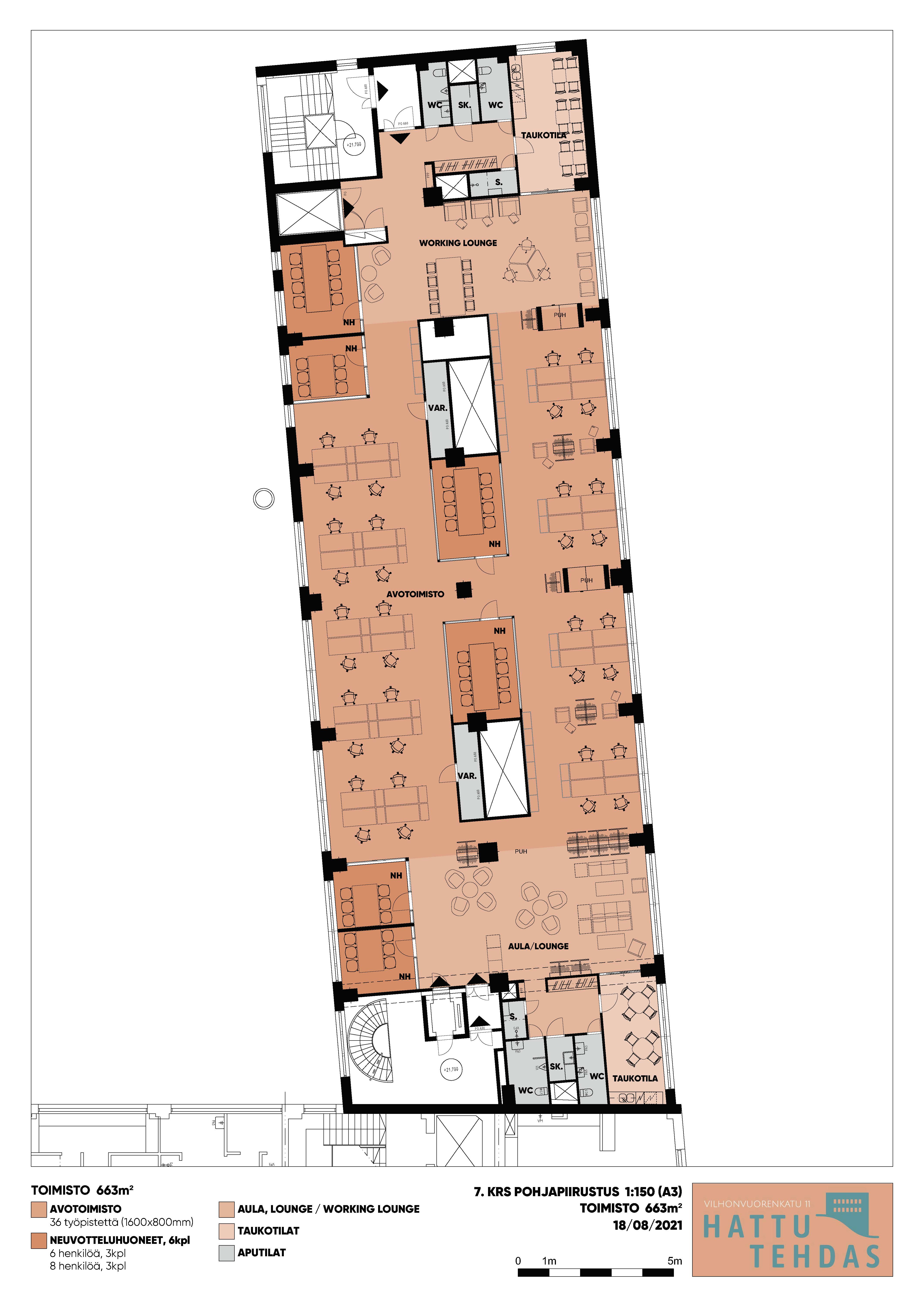Hattutalon seitsemännessä kerroksessa vapaana reilun kuudensadan neliön avotoimistotilaa, josta löytyy neuvotteluhuoneita ja taukotilat.