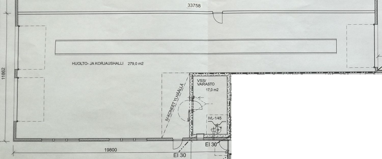 Raskaankaluston korjaamotila, jossa on viimeksi toiminut henkilöautokorjaamo. Tilat soveltuvat hyvin korjaamokäyttöön. Tilassa on huoltokuilu ja läpiajomahdollisuus. Tilaan johtaa kolme nosto-ovea ja korkeutta riittää kaikelle tiellä liikkuvalle.
