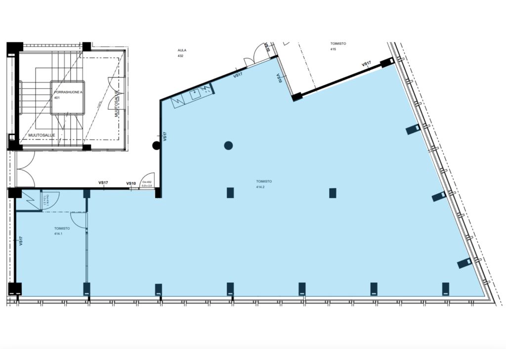 Tämä 223,5 m² toimistotila sijaitsee kiinteistön 4. kerroksessa. Tämä poikkeuksellisen valoisa huoneisto sijaitsee Kuparitalon “terävässä kärjessä” josta avautuu upeat näköalat joka suuntaan. Kuvat ovat yleiskuvia kiinteistön remontoiduista tiloista.