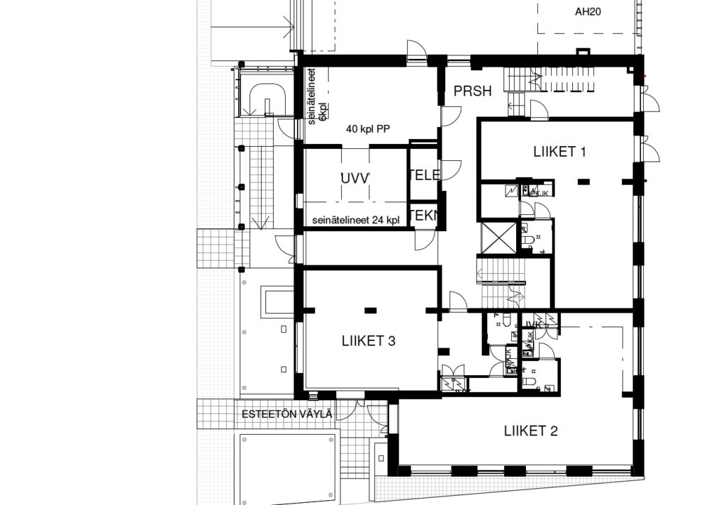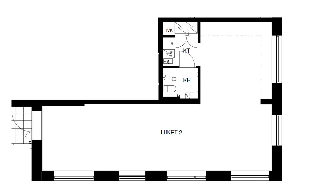 Tämä 66,5 m² liiketila sijaitsee katutasossa. Tila on avonainen, ja siihen kuuluu oma keittiöpiste ja wc-tila. Pohjakuvassa tämä liiketila on LT2. Liiketiloissa on jäähdytys.