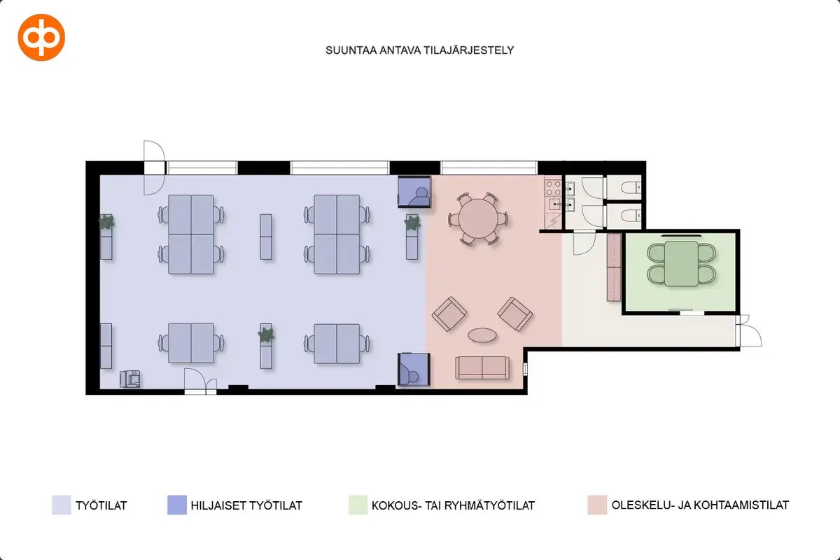 - Tilassa avotilaa, kaksi erillisetä neuvottelu- tai vetäytymishuoneiksi sopivaa tilaa, keittiö sekä wc-tilat.