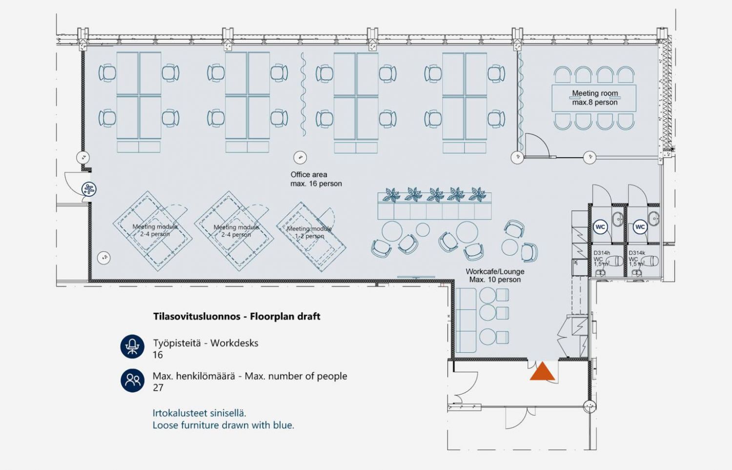 Tervetuloa Troolin D-rappuun! Tämä hiljattain kokonaan remontoitu, neliöiltään tehokas toimistotila tarjoaa loistavat puitteet työskentelyyn 10-27 hengelle. Valoisaan avotilaan mahtuu mukavasti tiimityöskentelyyn, ja lisäksi käytössäsi on erillinen neuvotteluhuone, joka soveltuu 8 hengen kokouksiin.