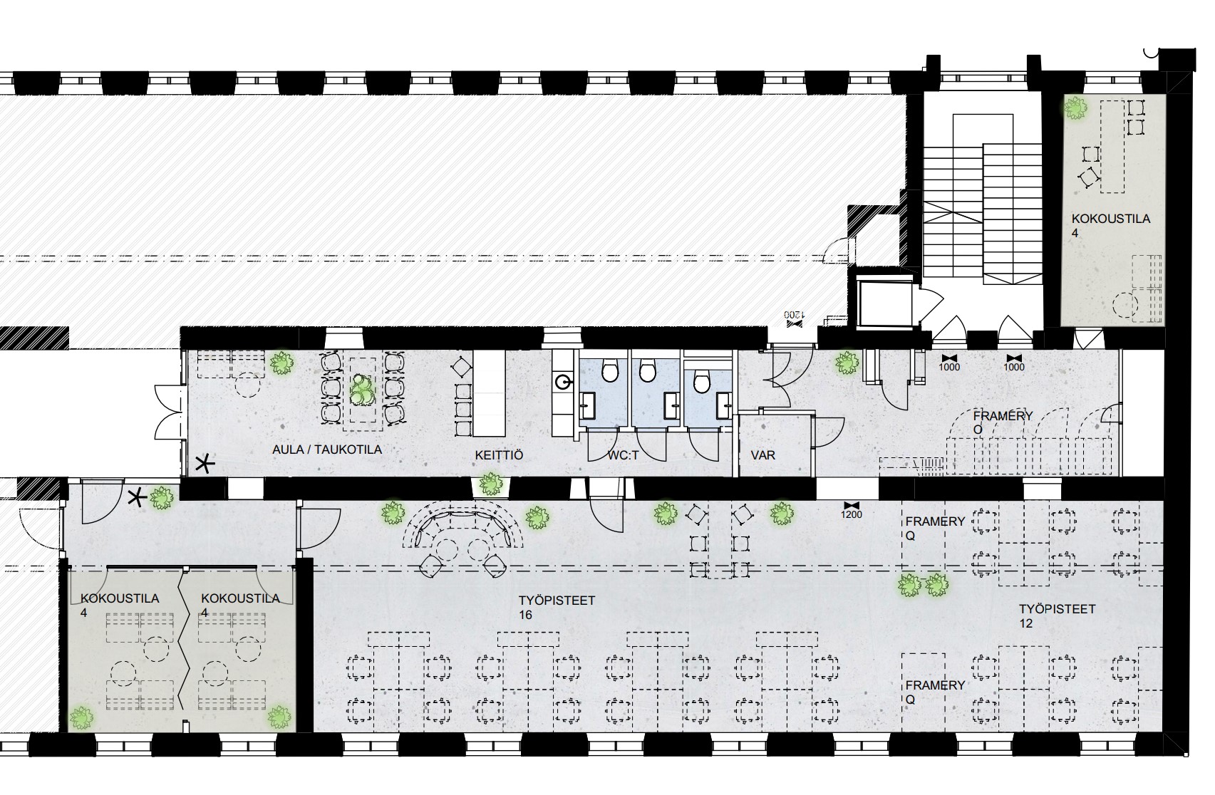 Avara ja tilankäytöltään tehokas pohjaratkaisu mahdollistaa jopa yli 25 työpisteen sijoittamisen tiloihin.