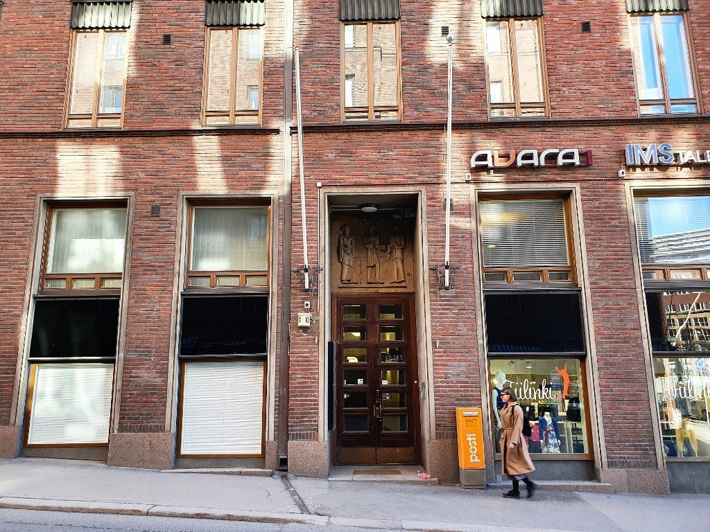 Pääsisäänkäynti on Kansakoulukujan puolella, mutta kulkuyhteys osaan tiloista on Fredrikinkadun puoleisesta päästä kiinteistöä.