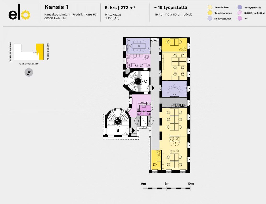 Jos etsitte edustavia tiloja, joissa on valoisat huoneet niin tämä on oikea valinta. Kohteen sijainti on erinomainen, sen ollessa vain 600 metrin kävelymatkan päässä Helsingin Päärautatieasemasta. Kampin kattavat palvelut ovat aivan vieressä.