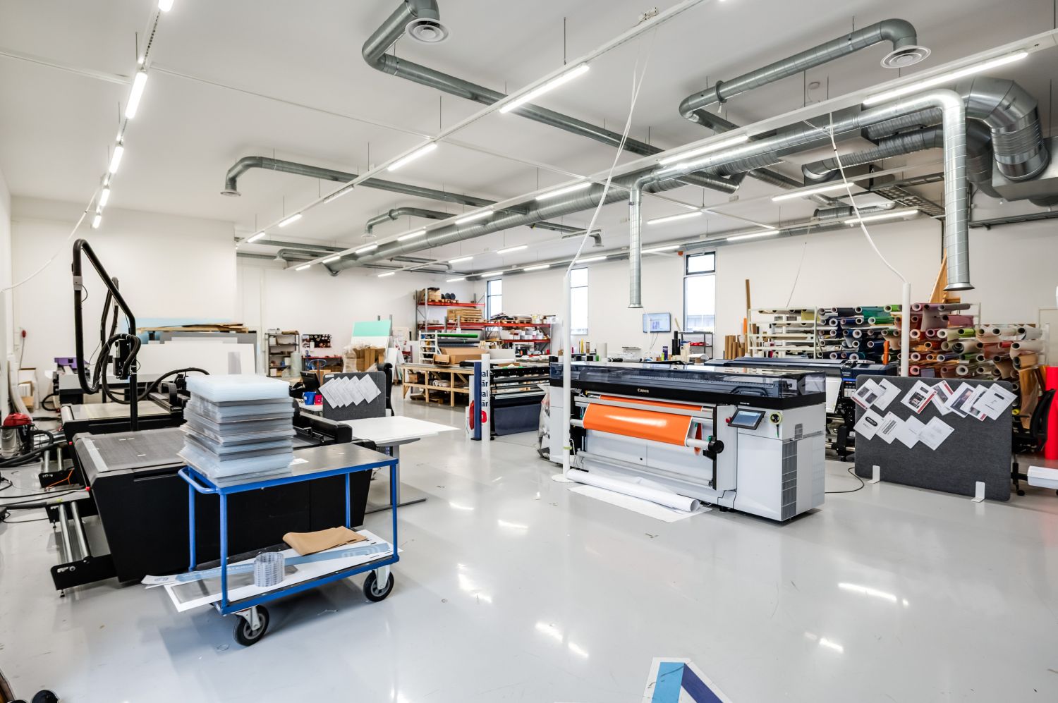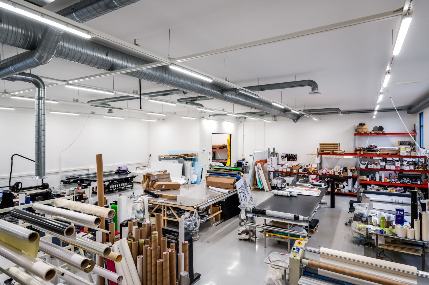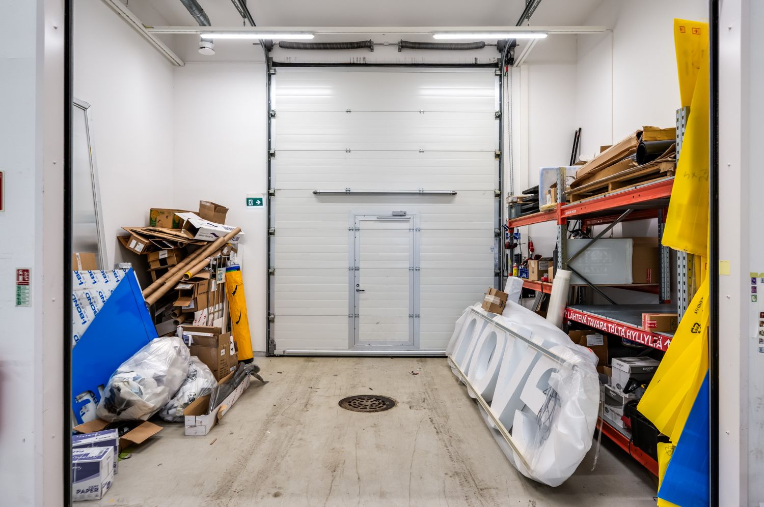 Toisessa päässä on korkea läpiajettava asennushallitila, jonka pinta-ala on n. 117 m2. Tästä ovellinen kulku tuotantopuolen tiloihin.