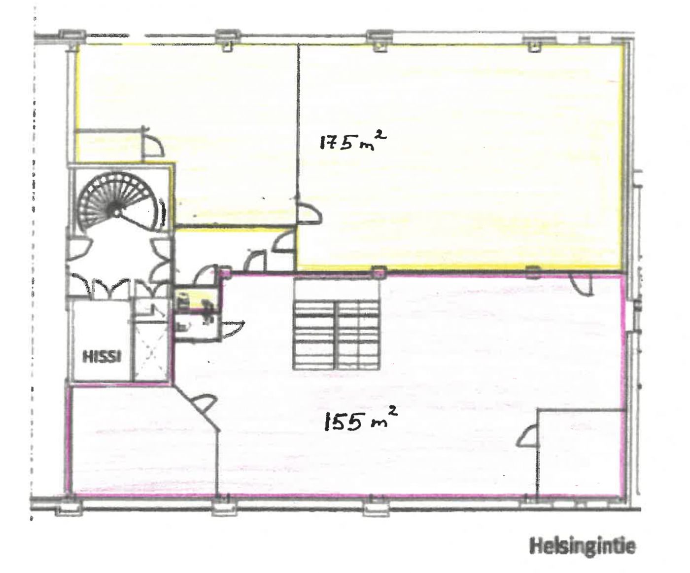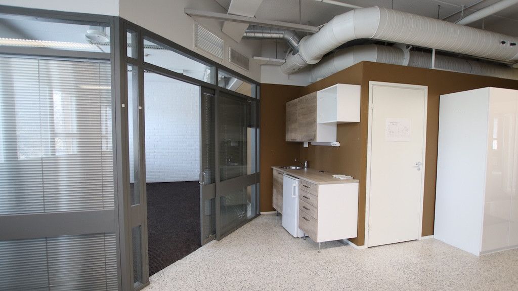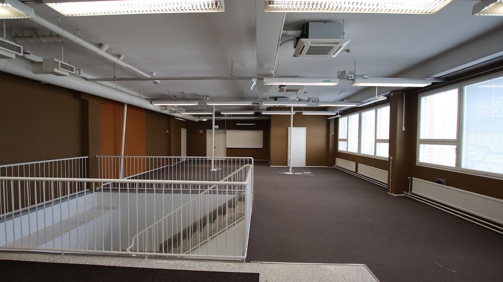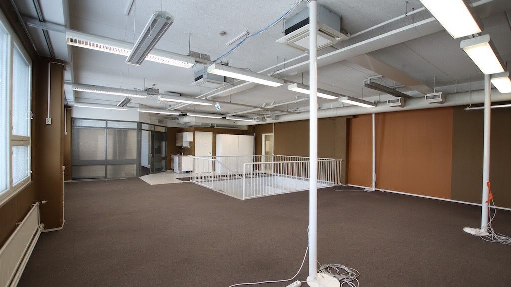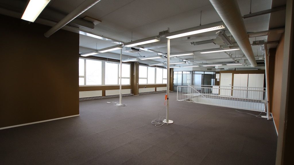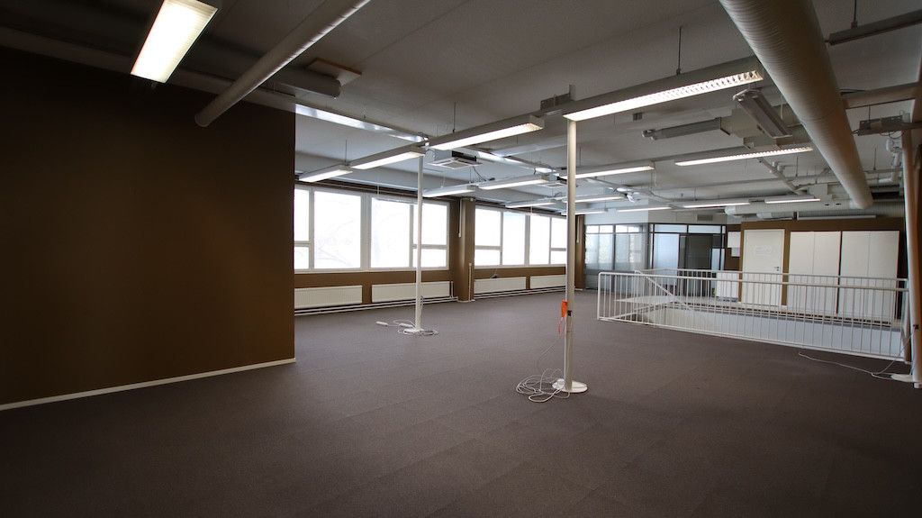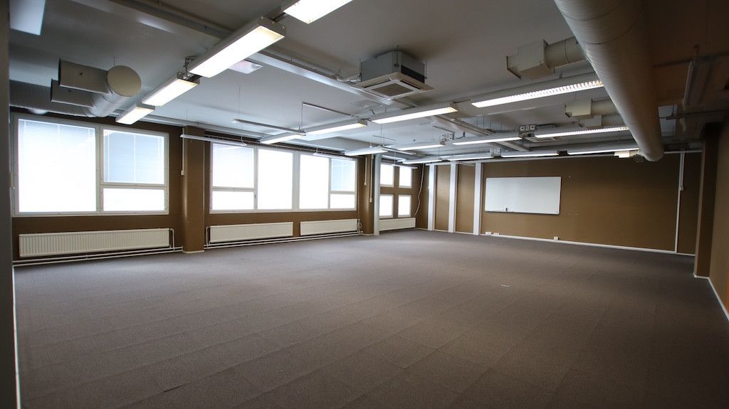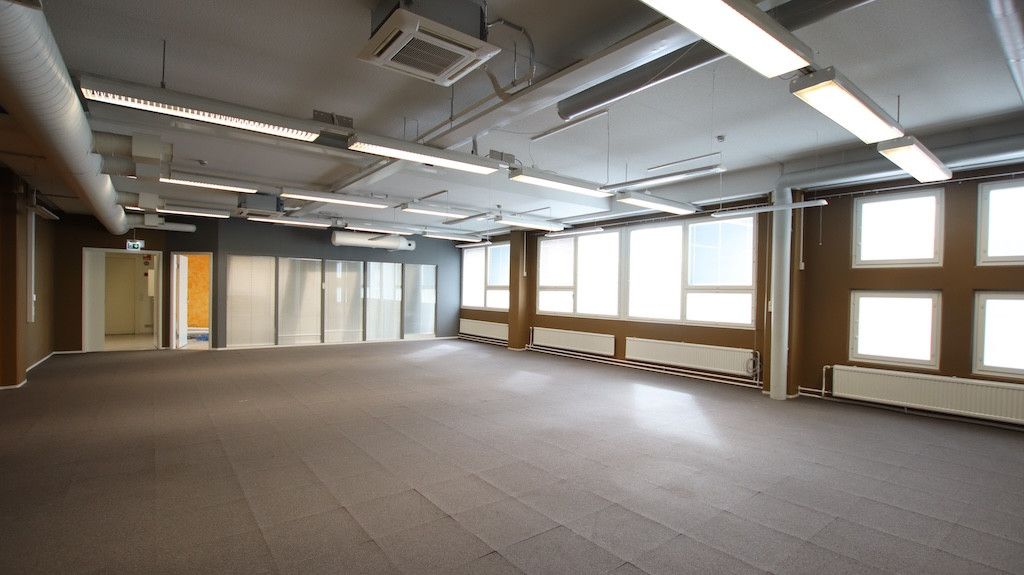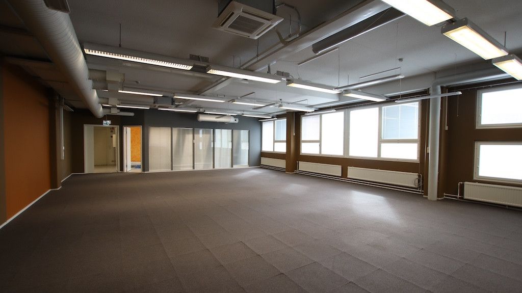 Toisen kerroksen avotoimistotila. Sisäänkäynti Helsingintein puolelta. Tila soveltuu mainiosti avotoimistokäyttöön tai tiimeille jaettavaksi.